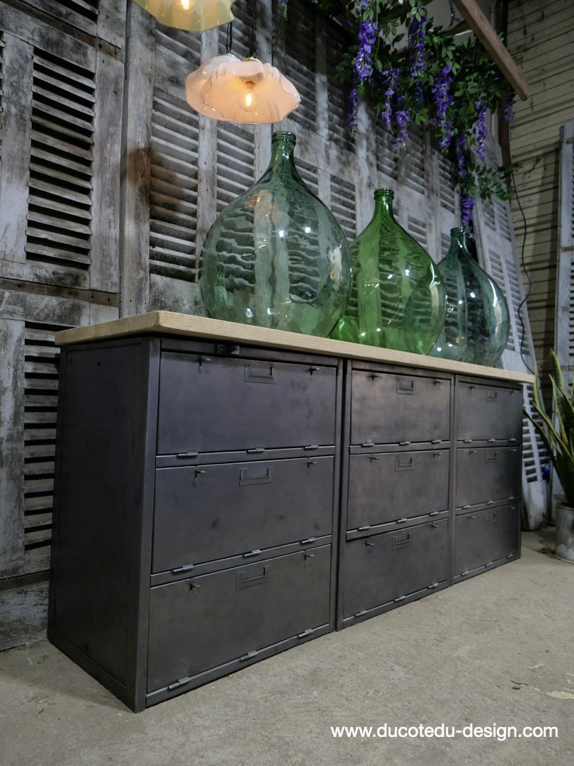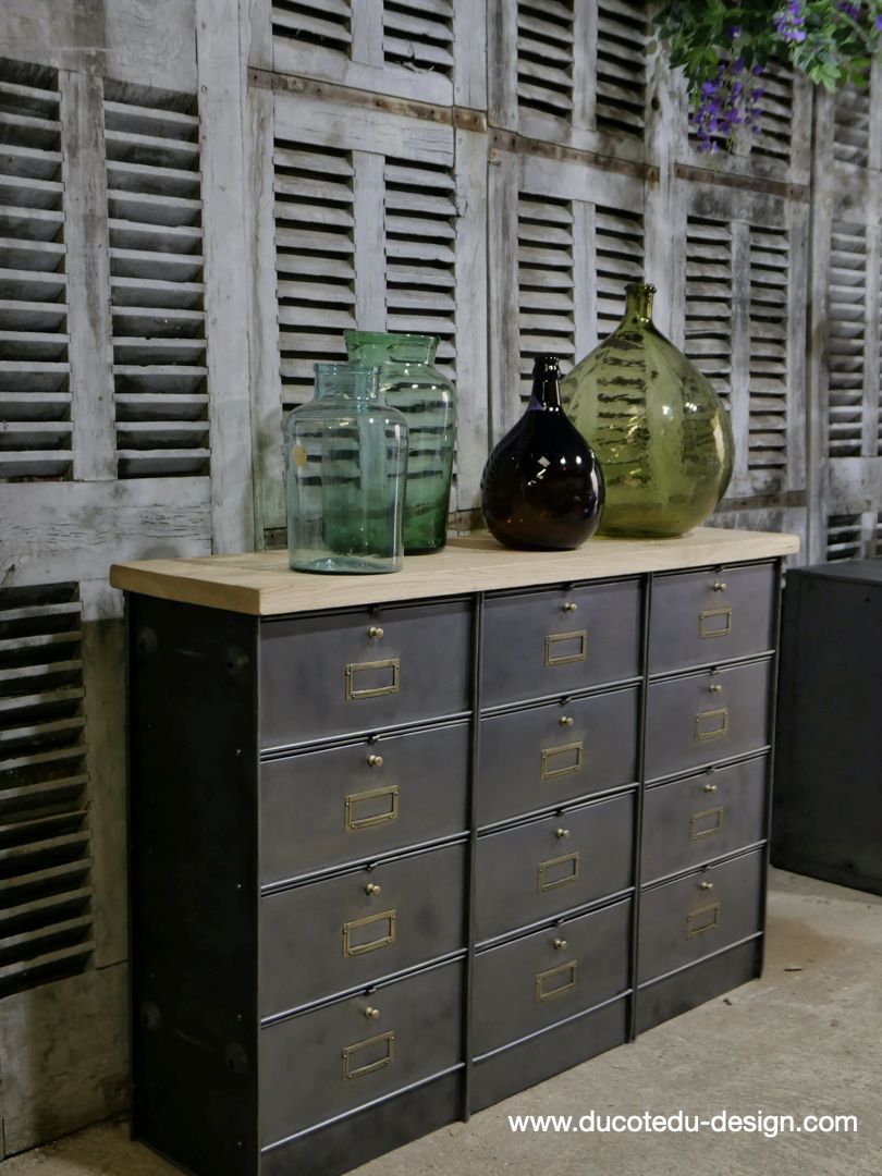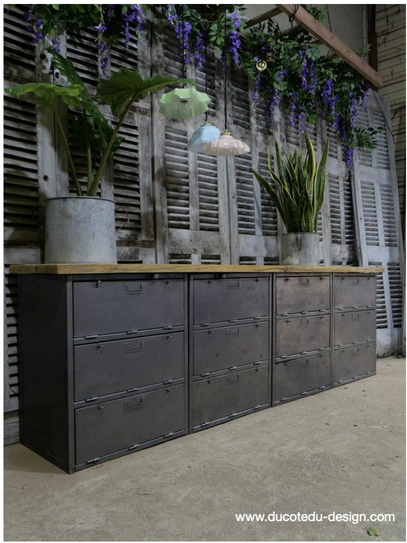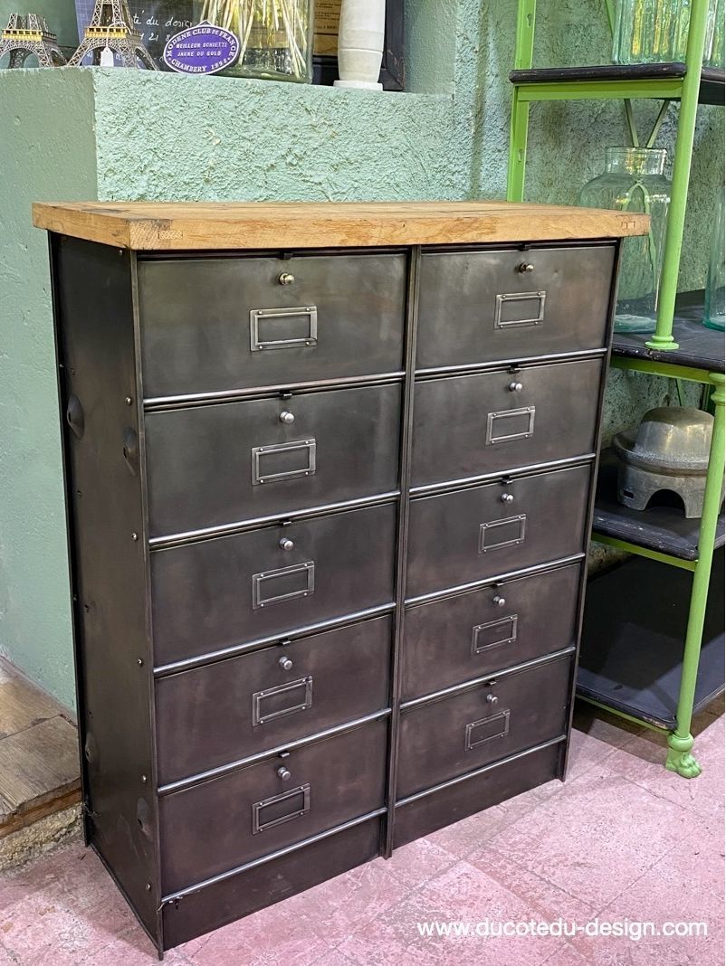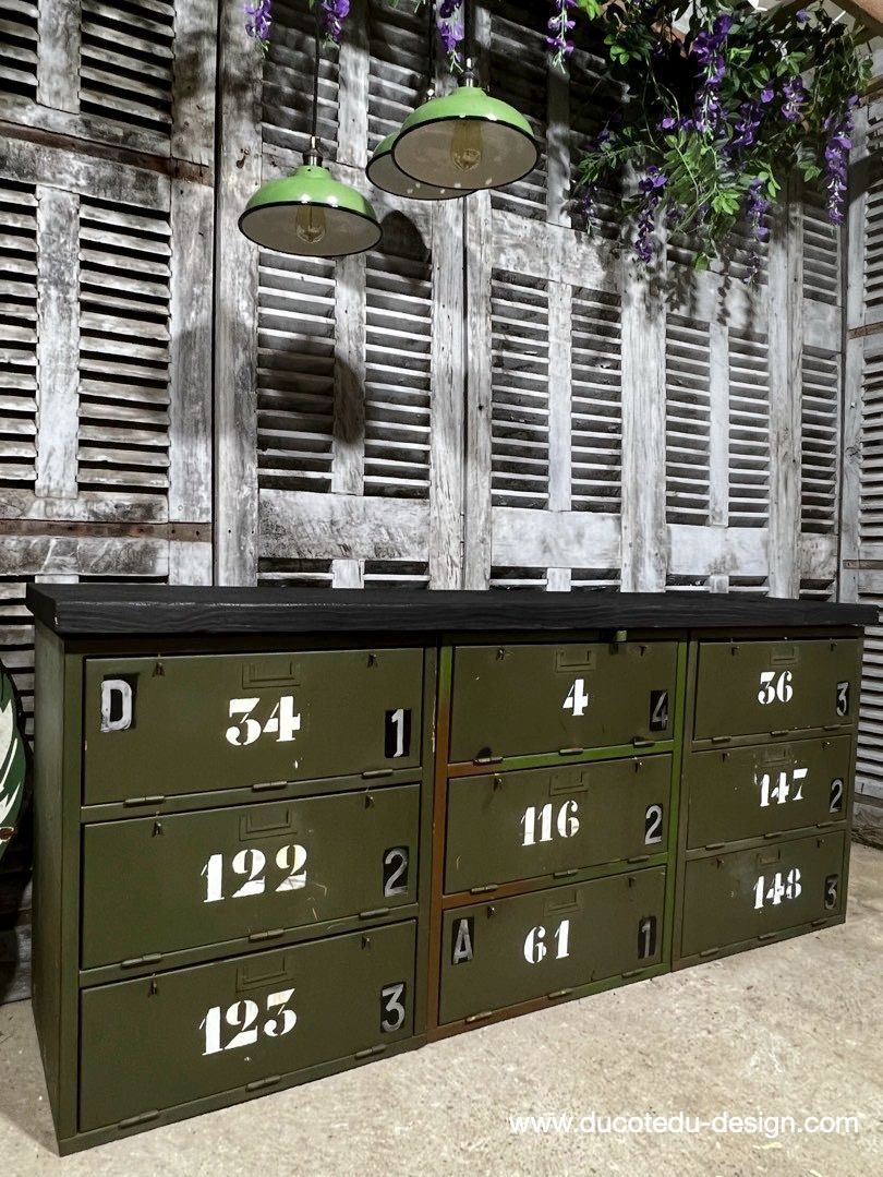 Ajouterenfilade industrielle 12 compartiments atelier militaire plateau massif bois brulé1350€Indisponible -