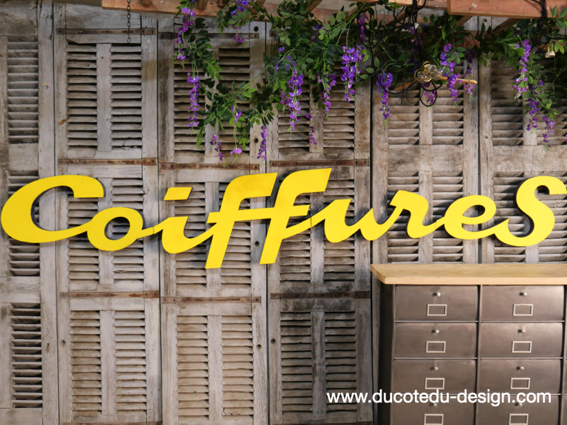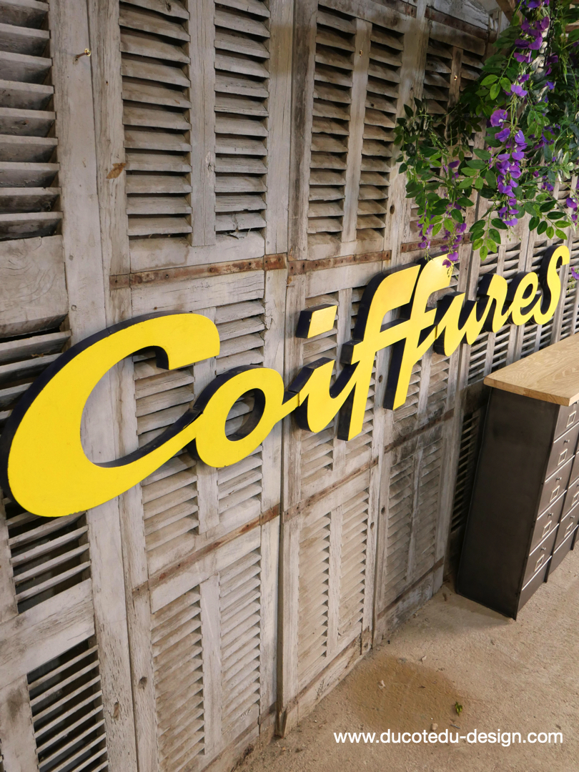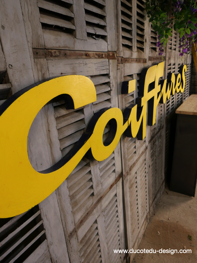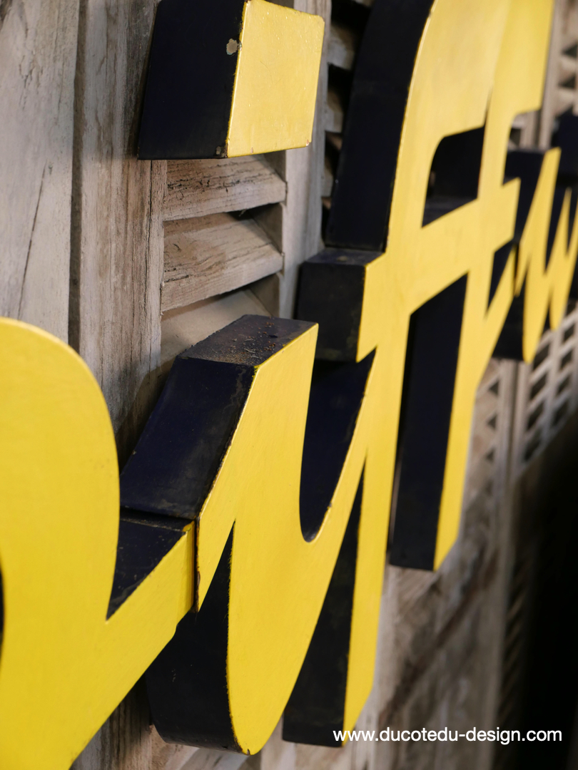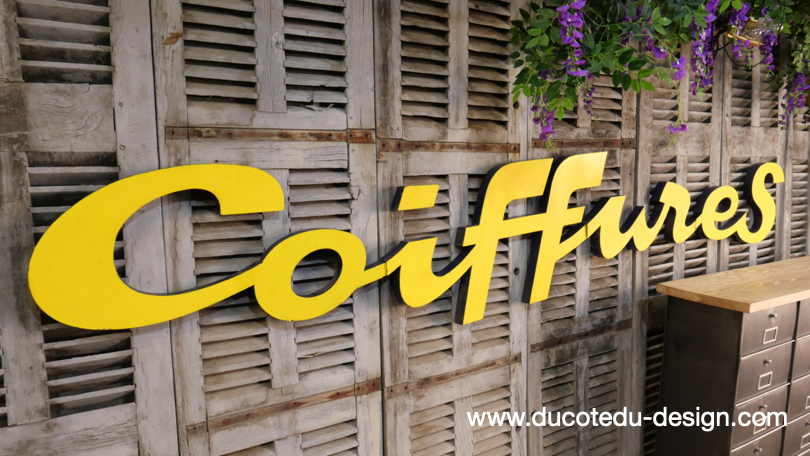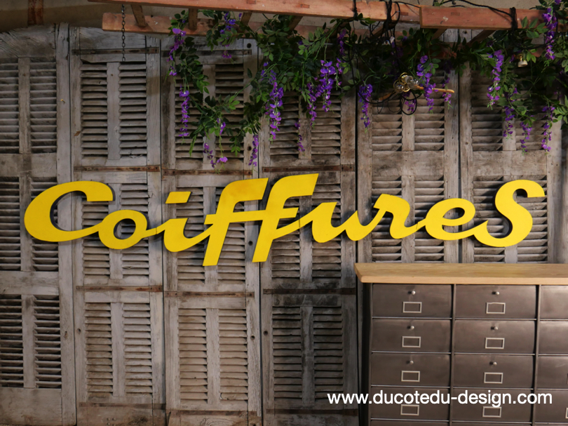 Rótulo metálico de un antiguo negocio de peluquería, amarillo con ribete azul, rótulo en su estado original, muy grande, 300cm x 50cm de alto