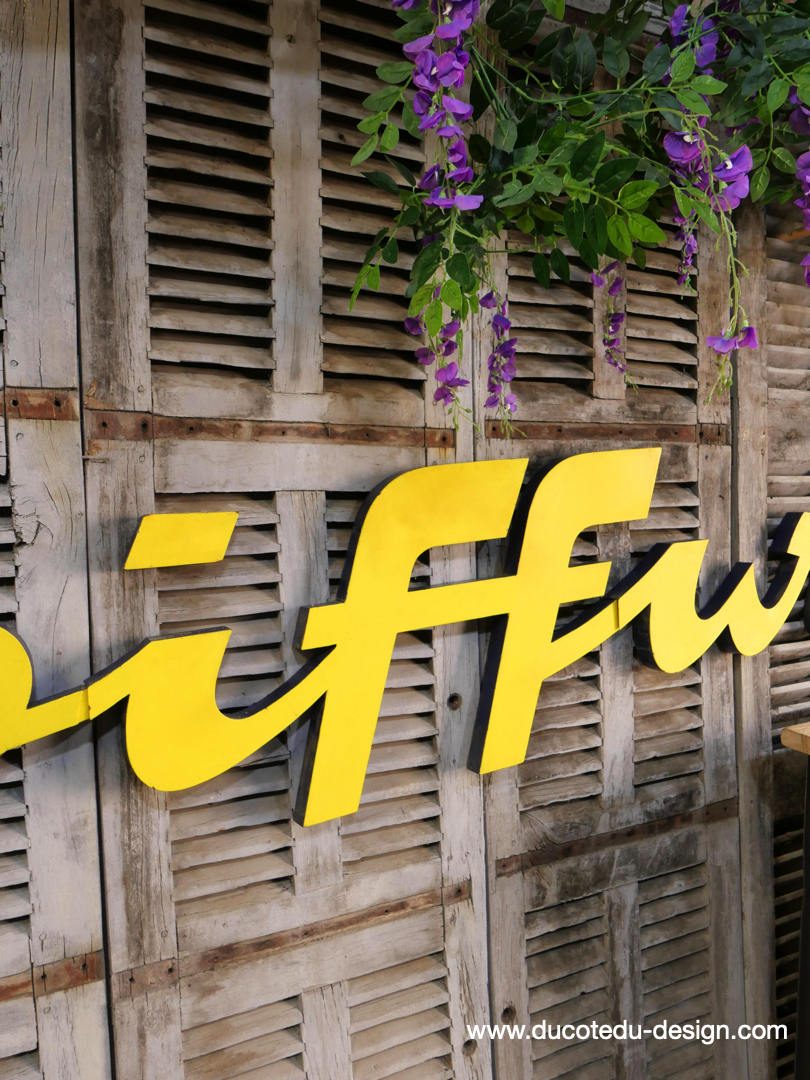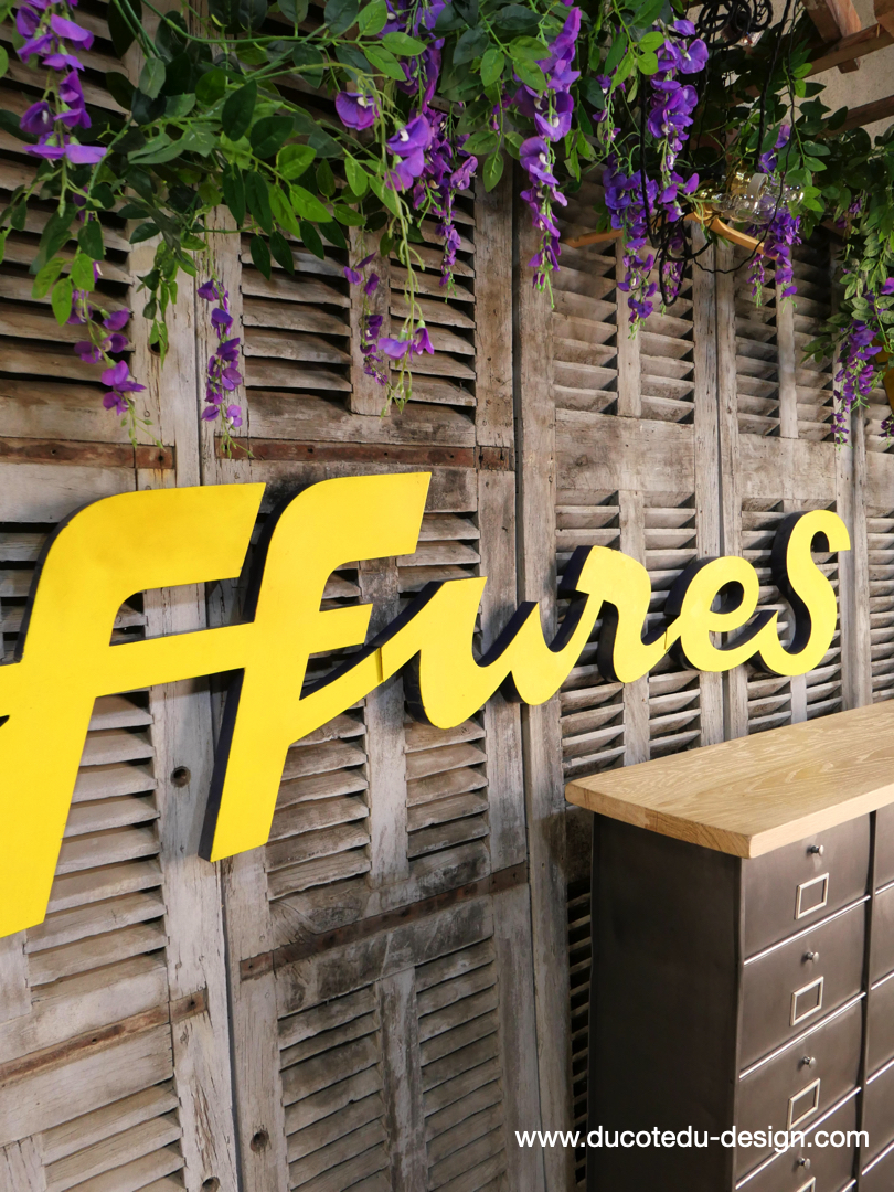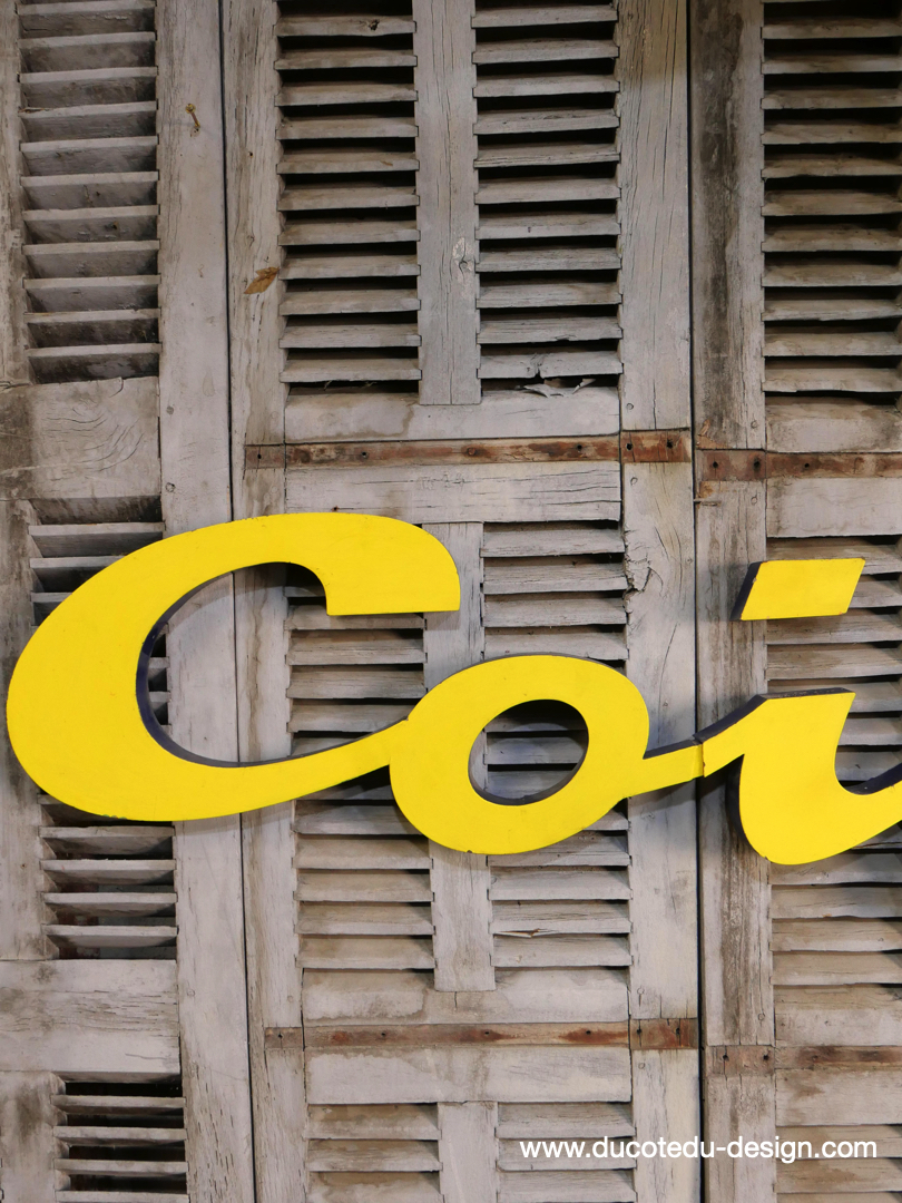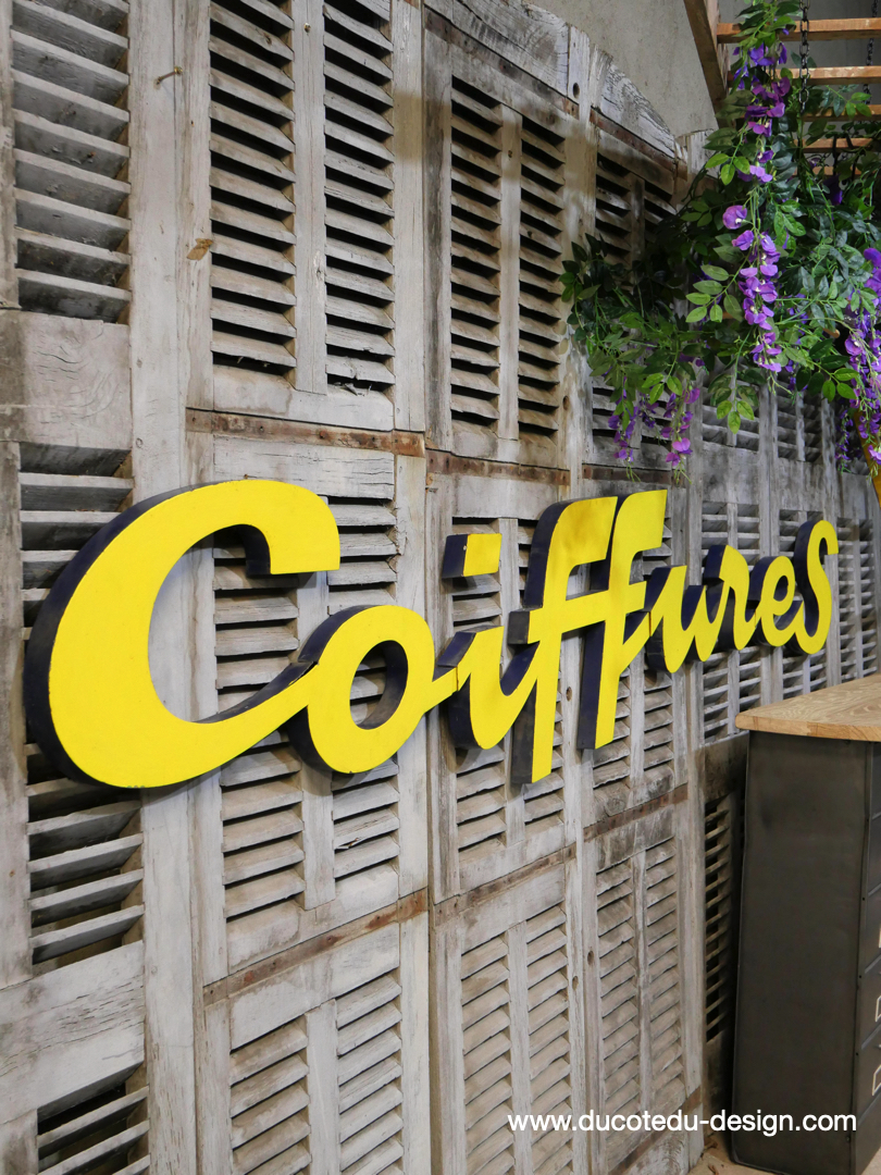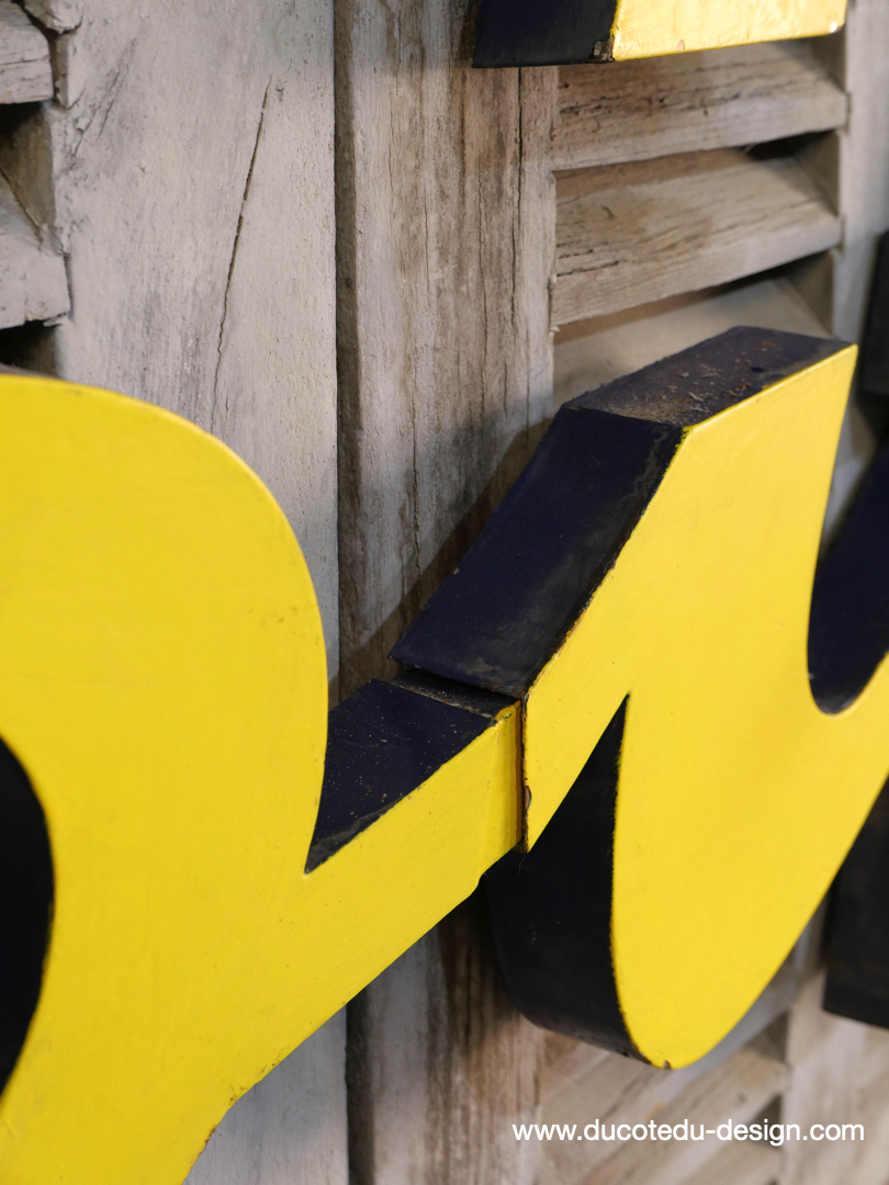 Rótulo metálico de un antiguo negocio de peluquería, amarillo con ribete azul, rótulo en su estado original, muy grande, 300cm x 50cm de alto