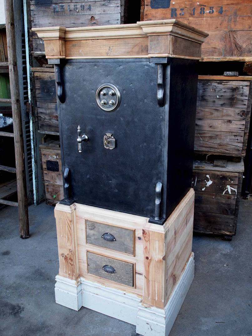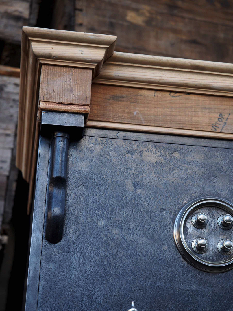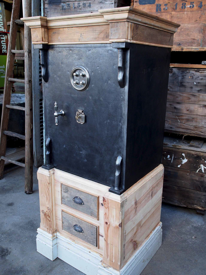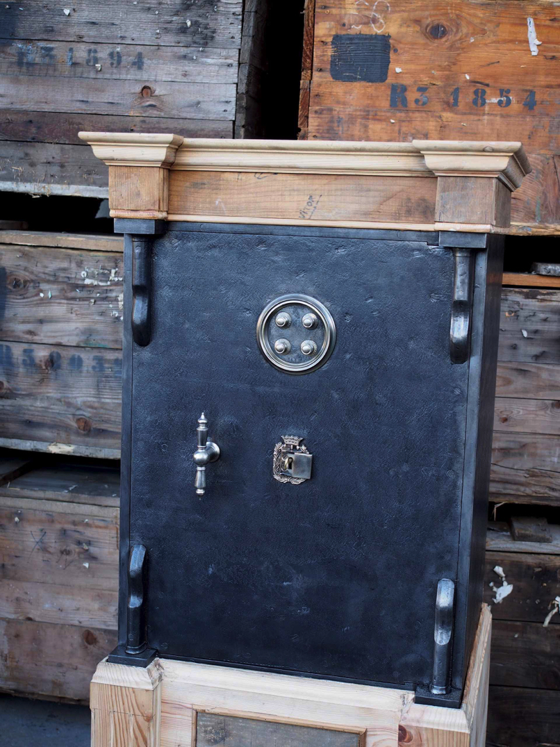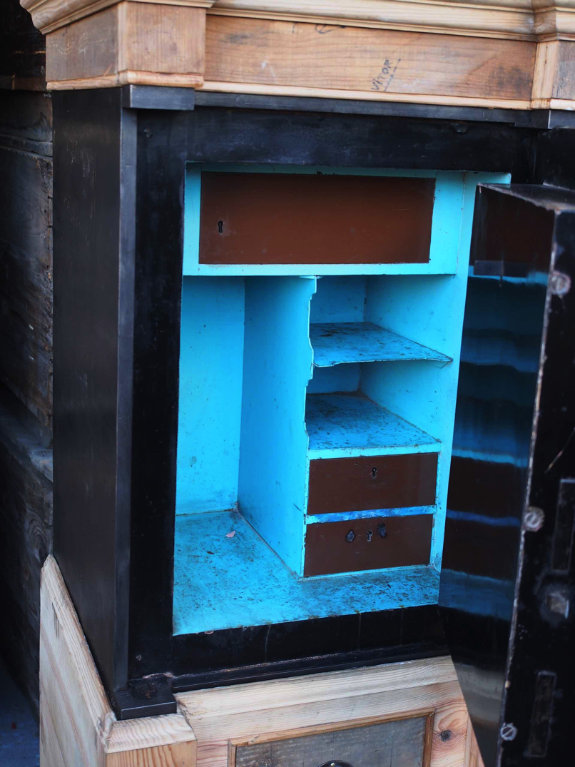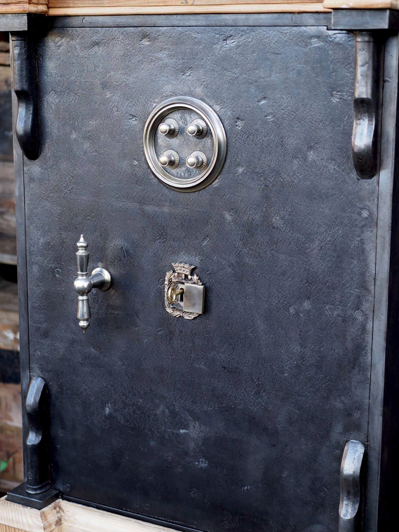 Ancien coffre fort des annees 30 metal / bois jeu de clés pour ouvrir serrure principale et petits compartiments avec code Toutes ces serrures fonctionnent parfaitement haut 152 cm. largeur 68 profondeur 52 cm tres grand tres lourd Forfait livraison sur palette par transporteur