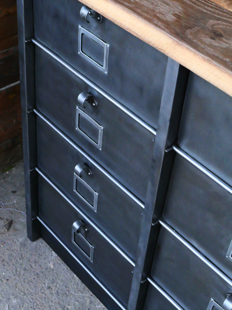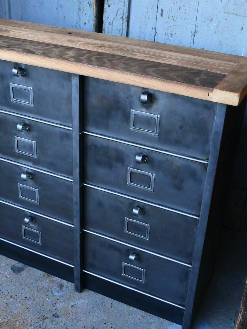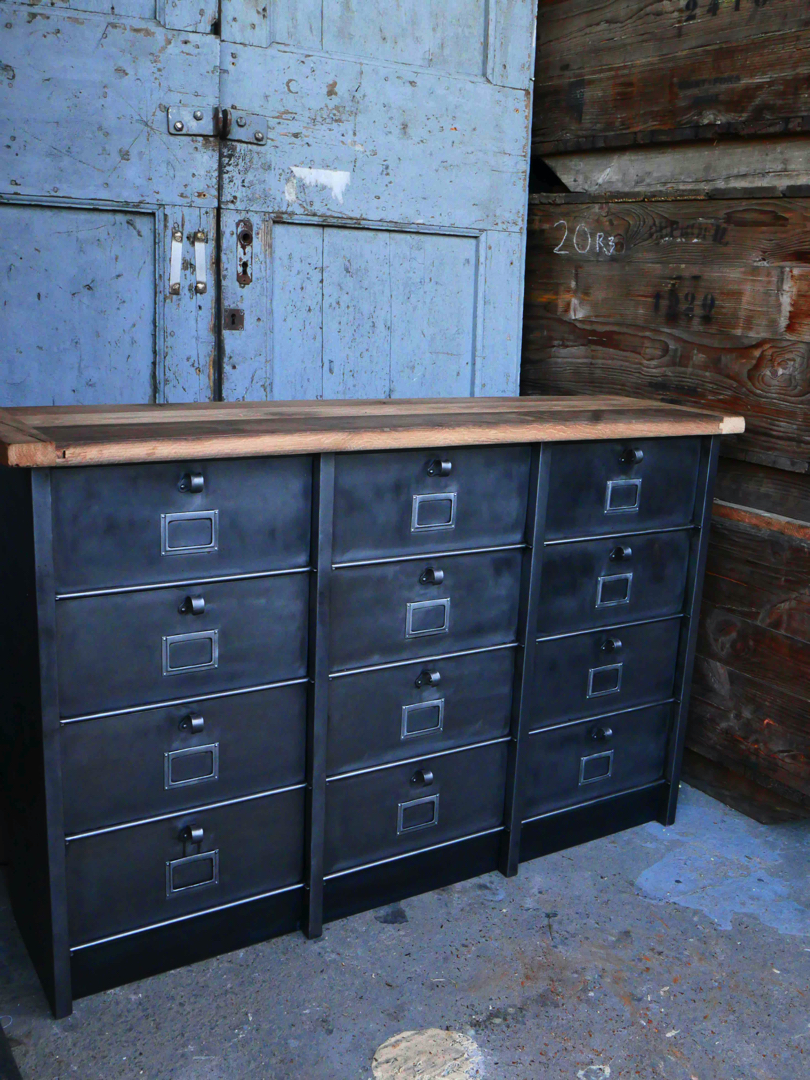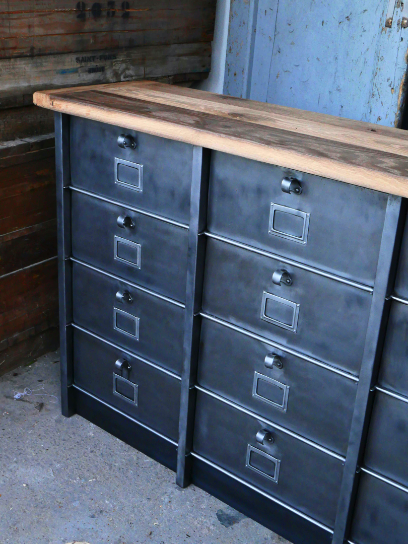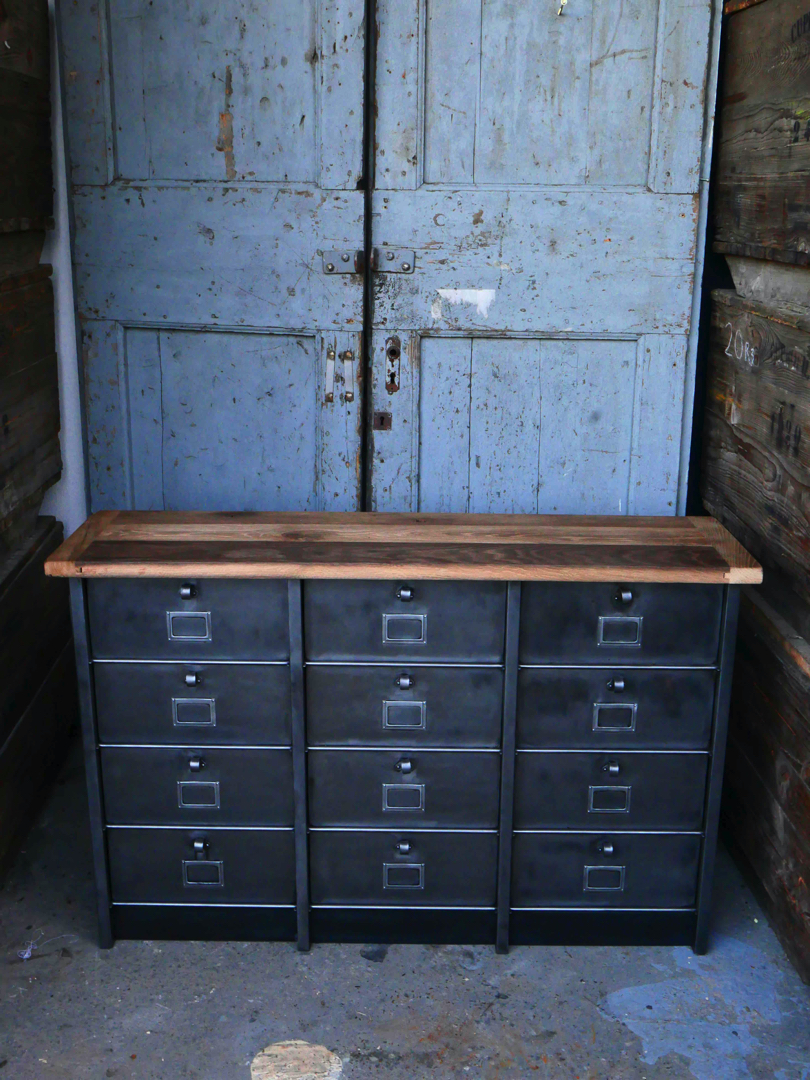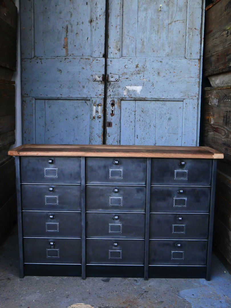 ancien grand meuble 12 casiers industriel strafor plateau chene massif