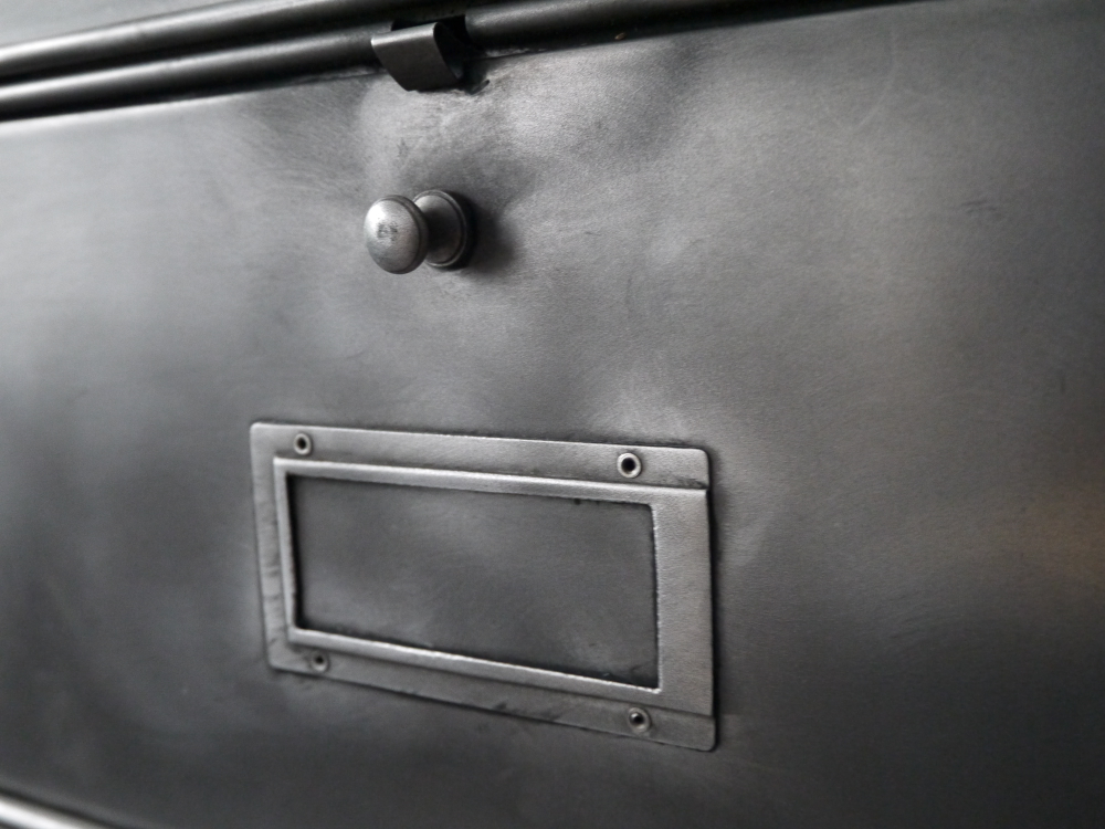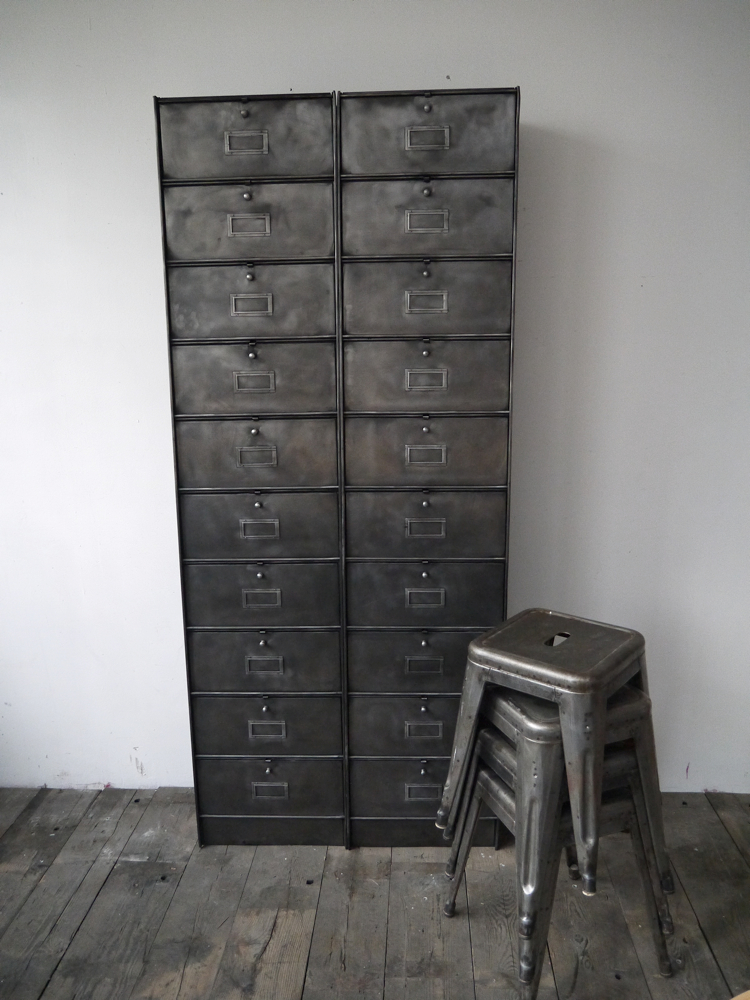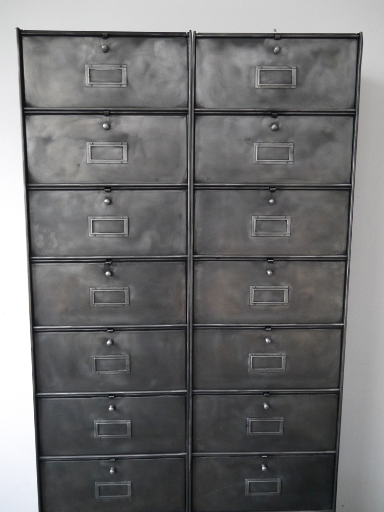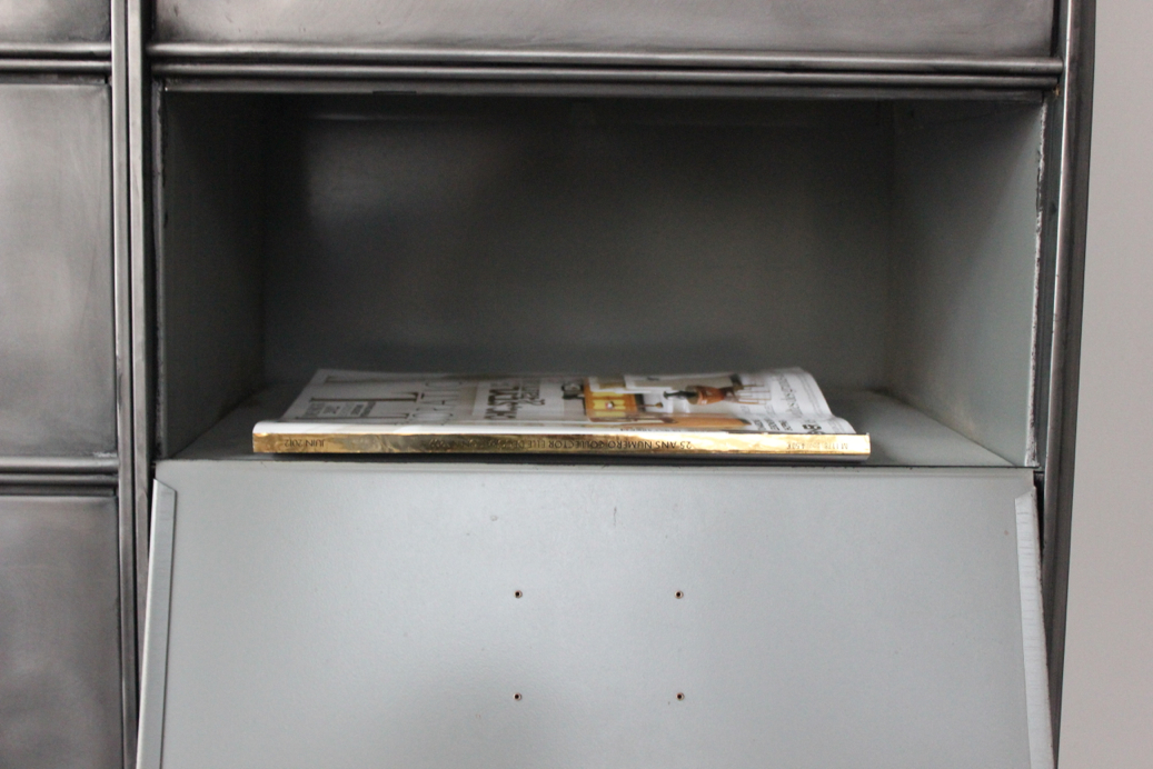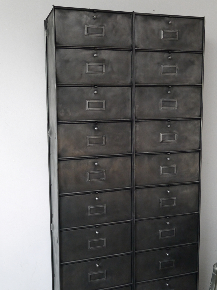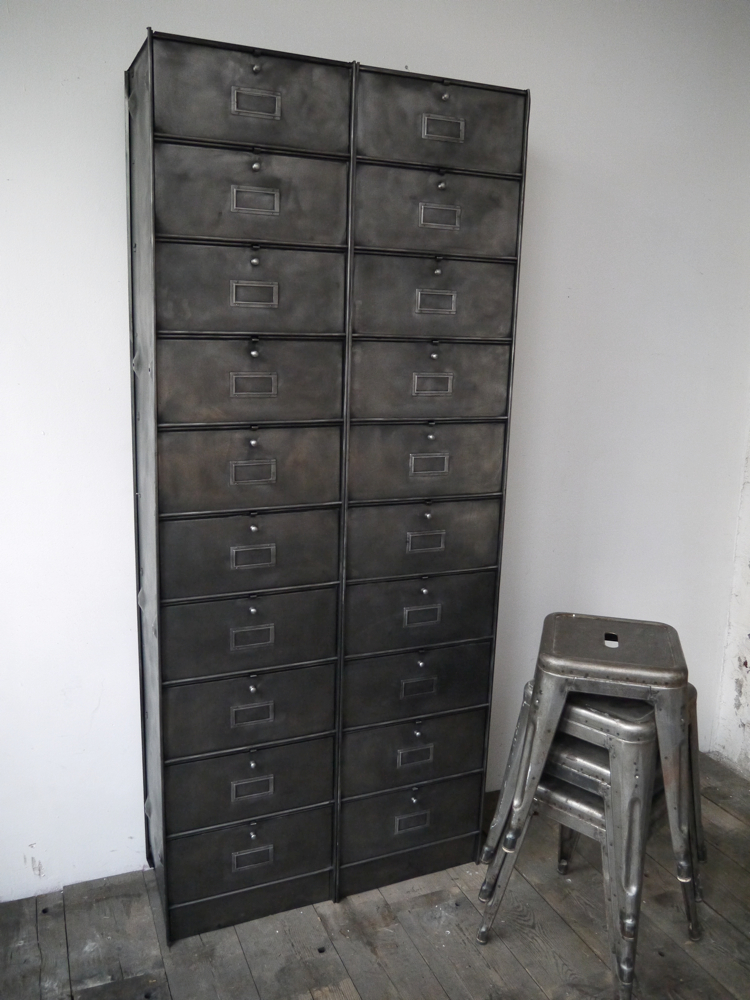 Ancien meuble industriel a clapet Roneo 20 casiers, portes etiquette et boutons laitonnés années 1950 / 1960 Mobilier ideal pour une deco industrielle meuble de rangement / tri metallique aux lignes tres pures dim 80 / 30 cm haut 198 cm. Le metal a été décapé, teinté graphite et  traité contre la corrosion Forfait livraison à votre domicile par transporteur pour la France metropolitaine 80 euros