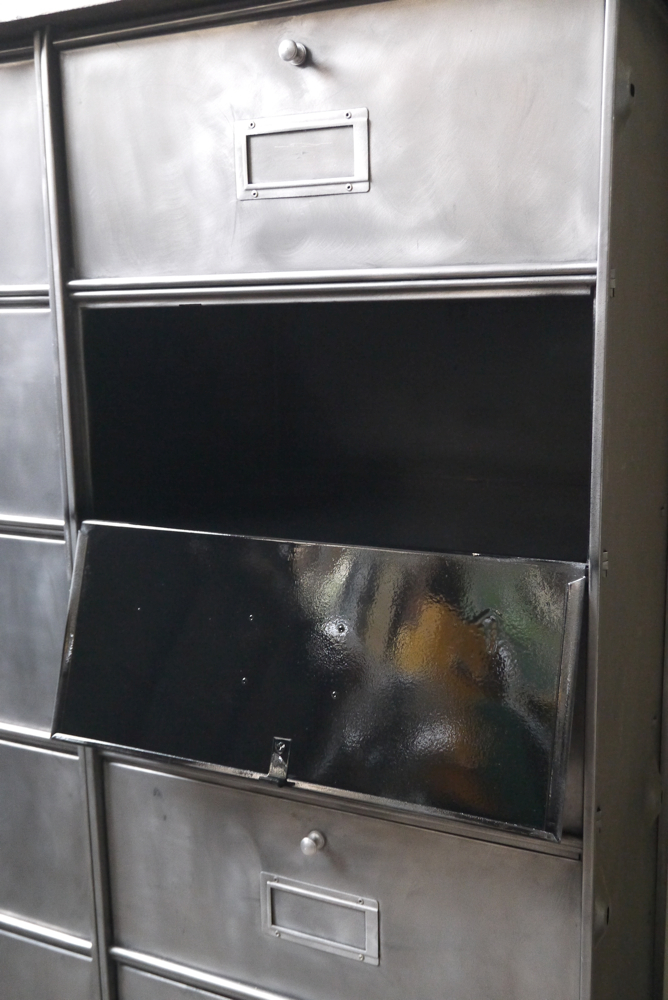 Ancien meuble industriel a clapet roneo 10 casiers, portes etiquette et boutons