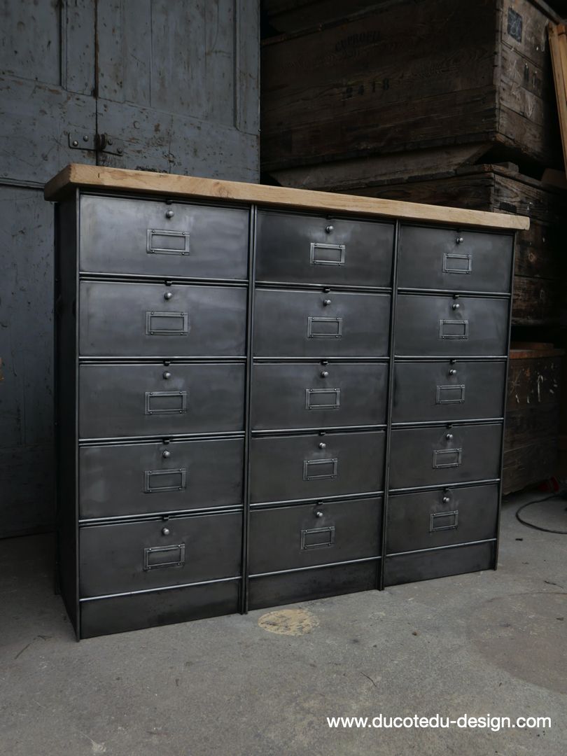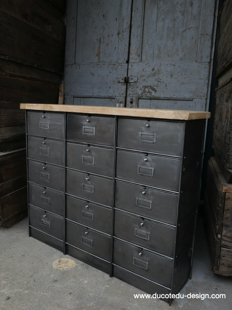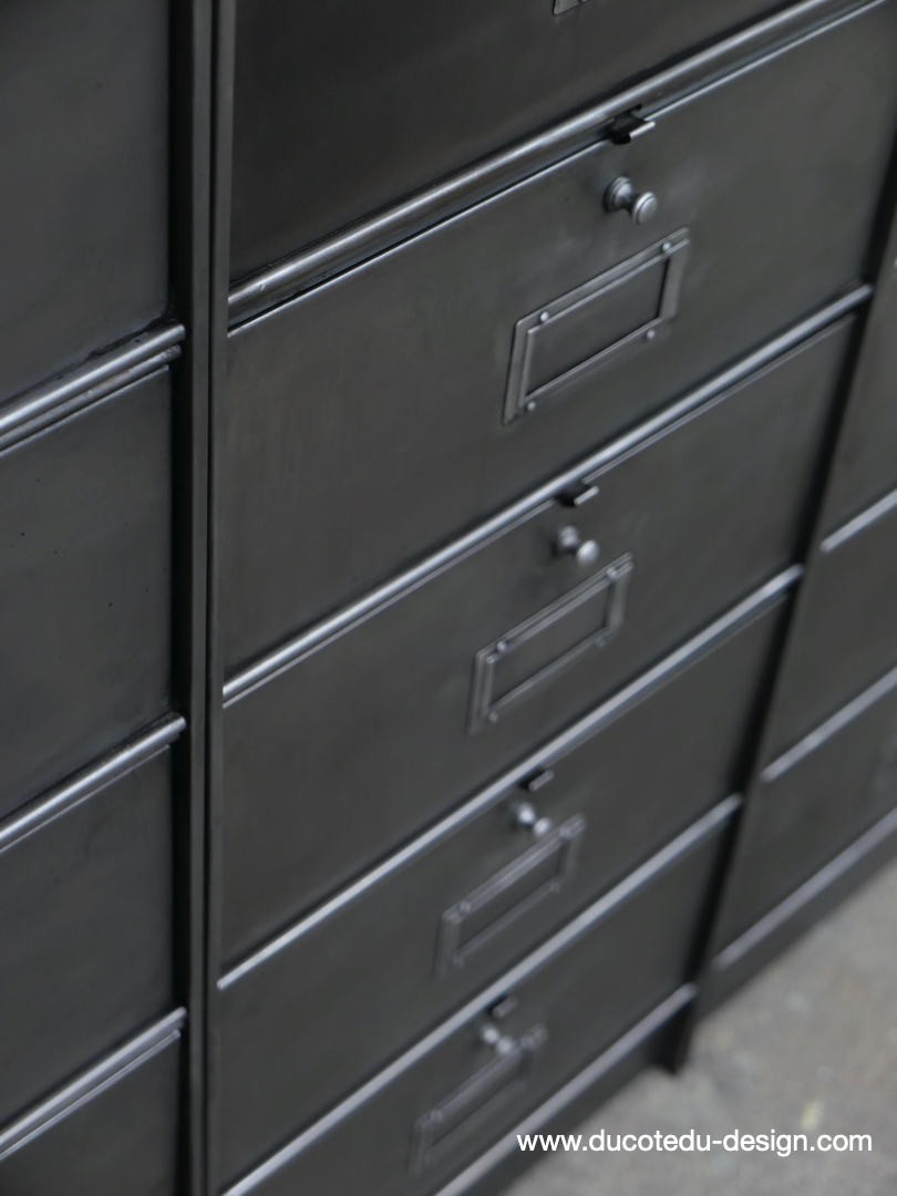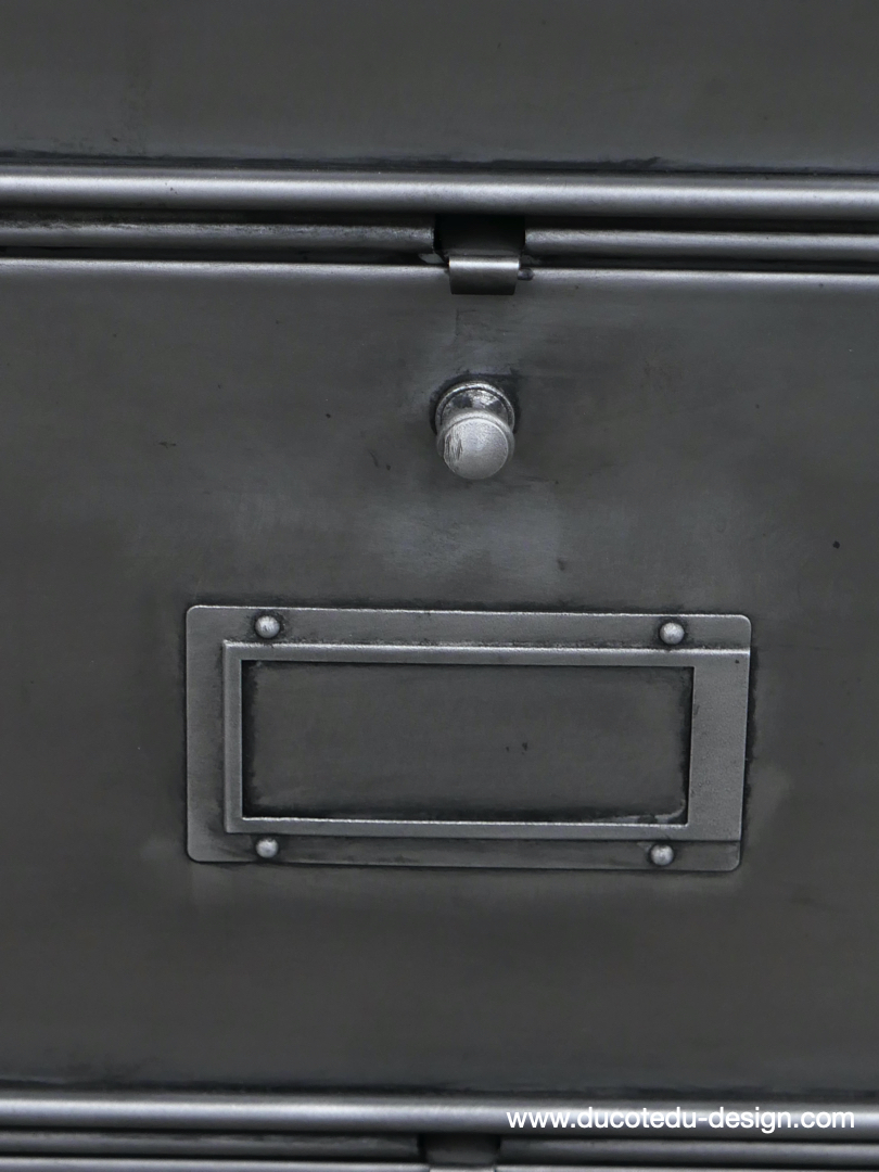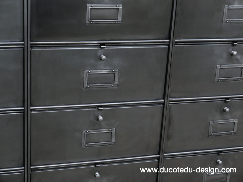 Ancien meuble industriel a clapet Roneo 15 casiers, portes etiquette et boutons   plateau massif  années 1950 / 1960 Mobilier ideal pour une deco industrielle meuble de rangement / tri metallique aux lignes tres pures longueur : 130 cm / profondeur : 32 / hauteur : 109 cm Le metal a été décapé, teinté graphite et  traité contre la corrosion Forfait livraison à votre domicile par transporteur