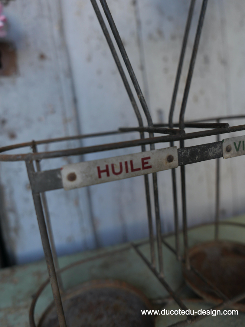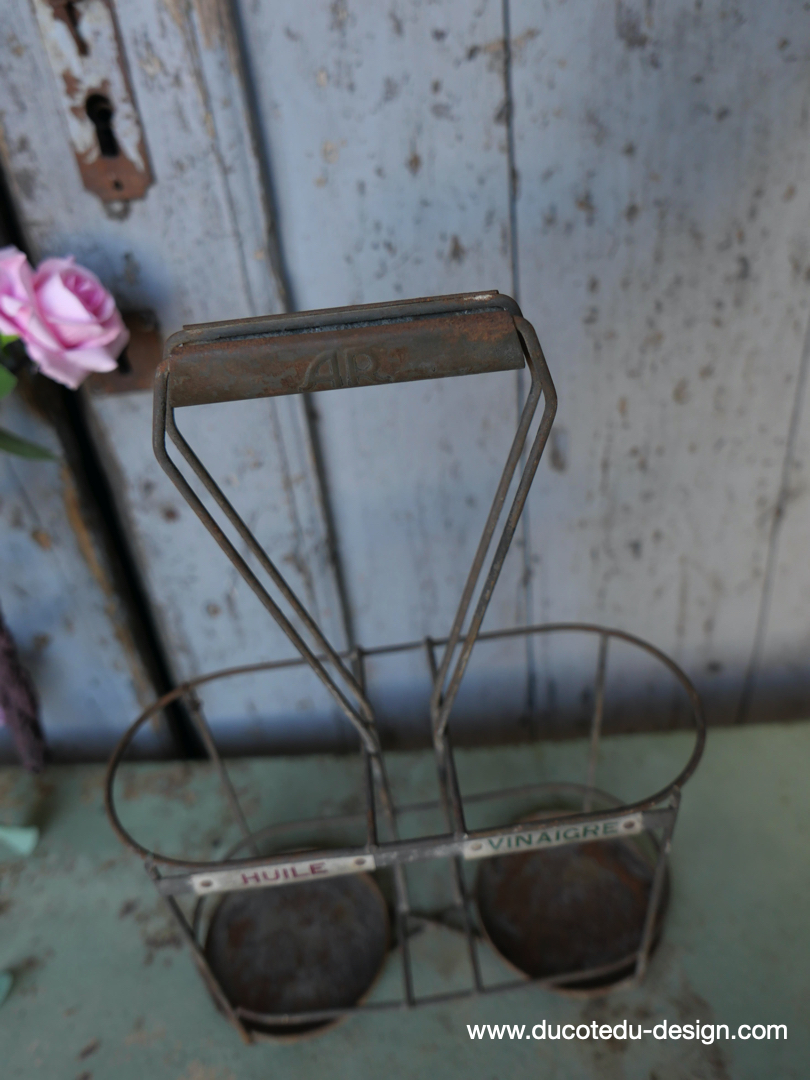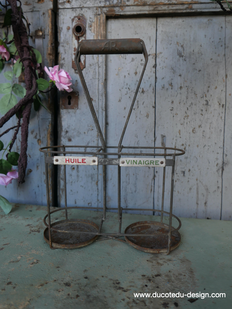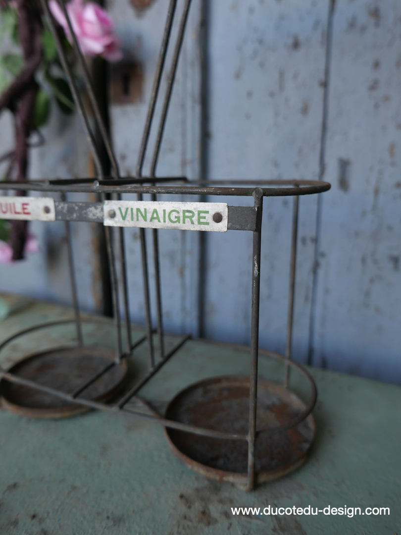 Ancien porte bouteille en metal huile et vinaigre haut 34, larg 24, prof 10 cm diametre des reposes bouteille 9 cm