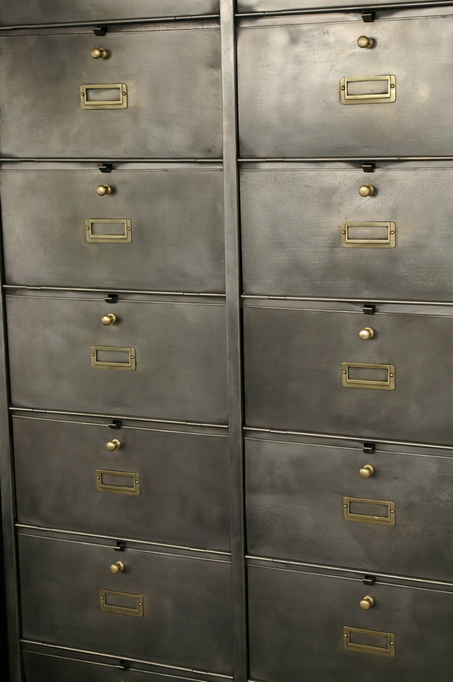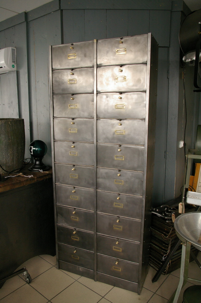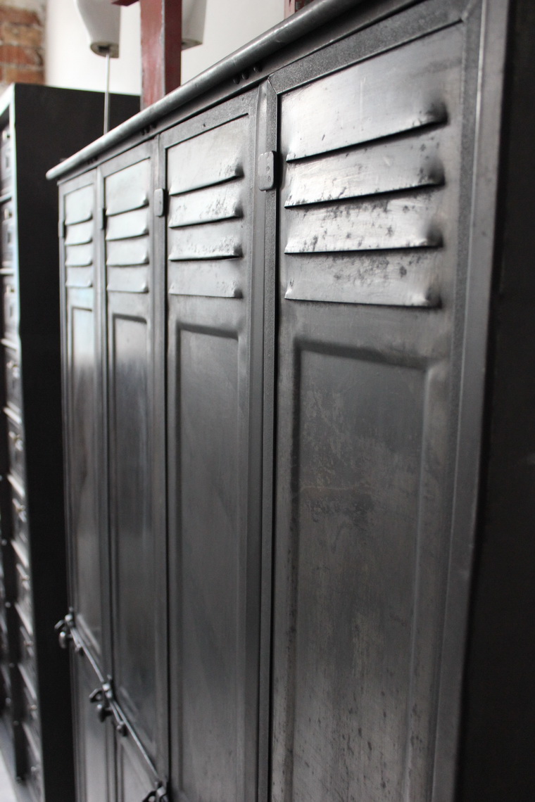 ancien vestiaire d'usine 4 portes de belles proportions entirement riveté ideal pour une deco industrielle meuble entierement metallique embouti hauteur 175 cm / longeur 120 / profondeur 30 casier 30 x 30 cm Livraison par transporteur 198 euros pour la France metropolitaine Le metal a été traité contre la corrosion