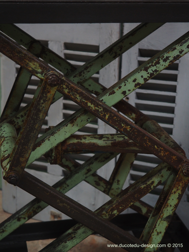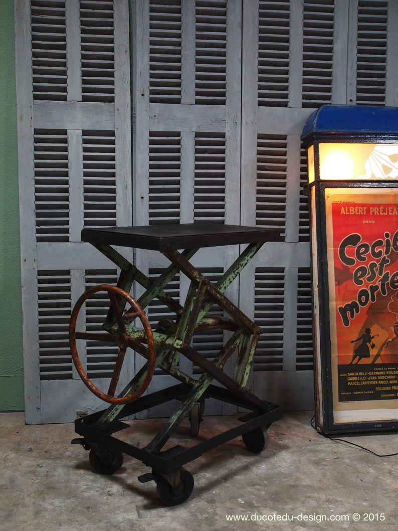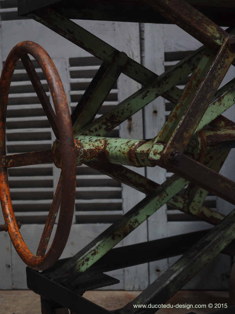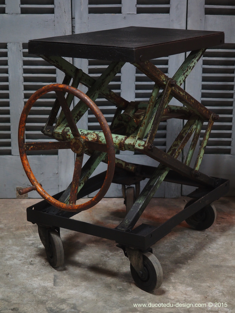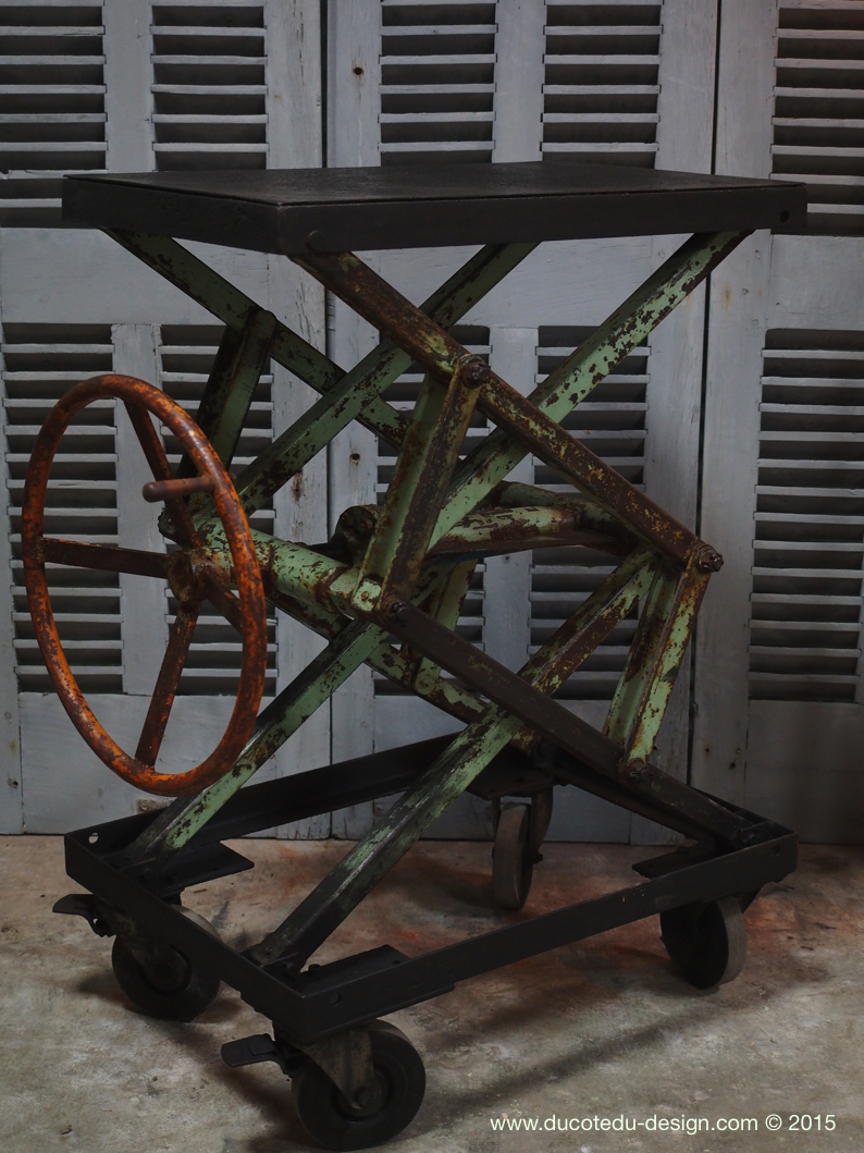 Ancienne table elevatrice d’atelier console ou table basse patine d’origine