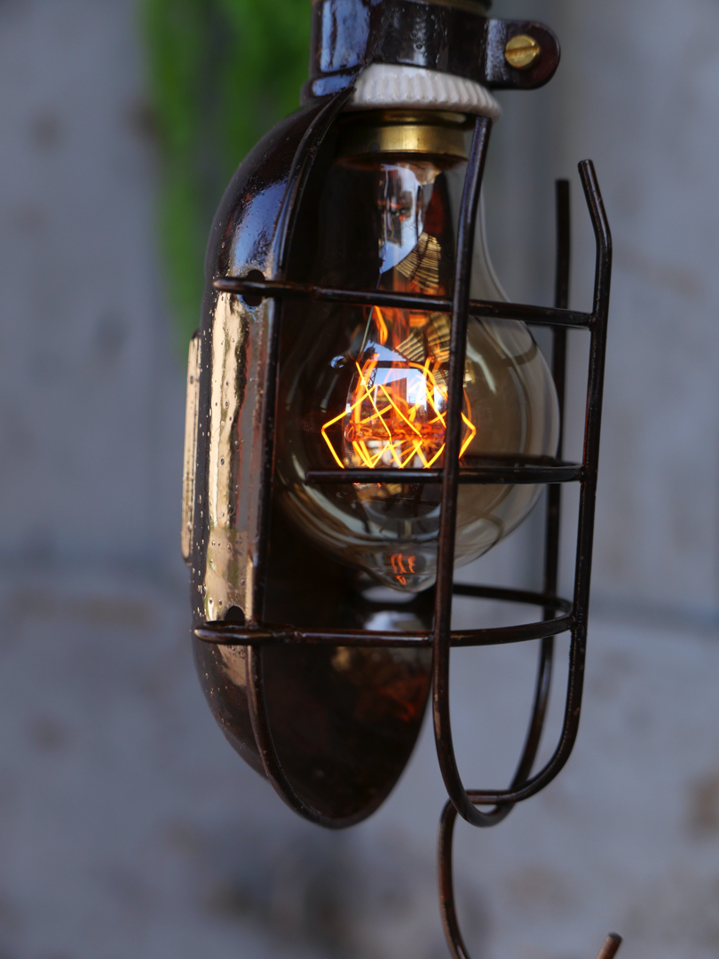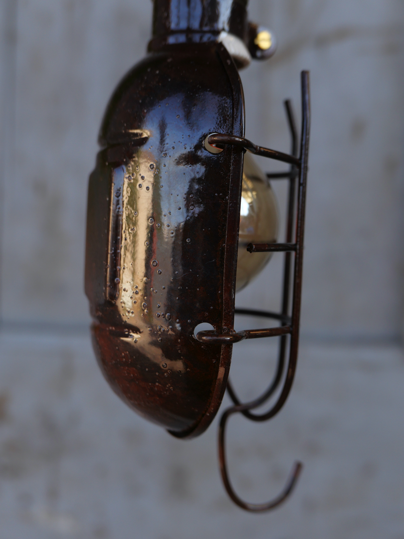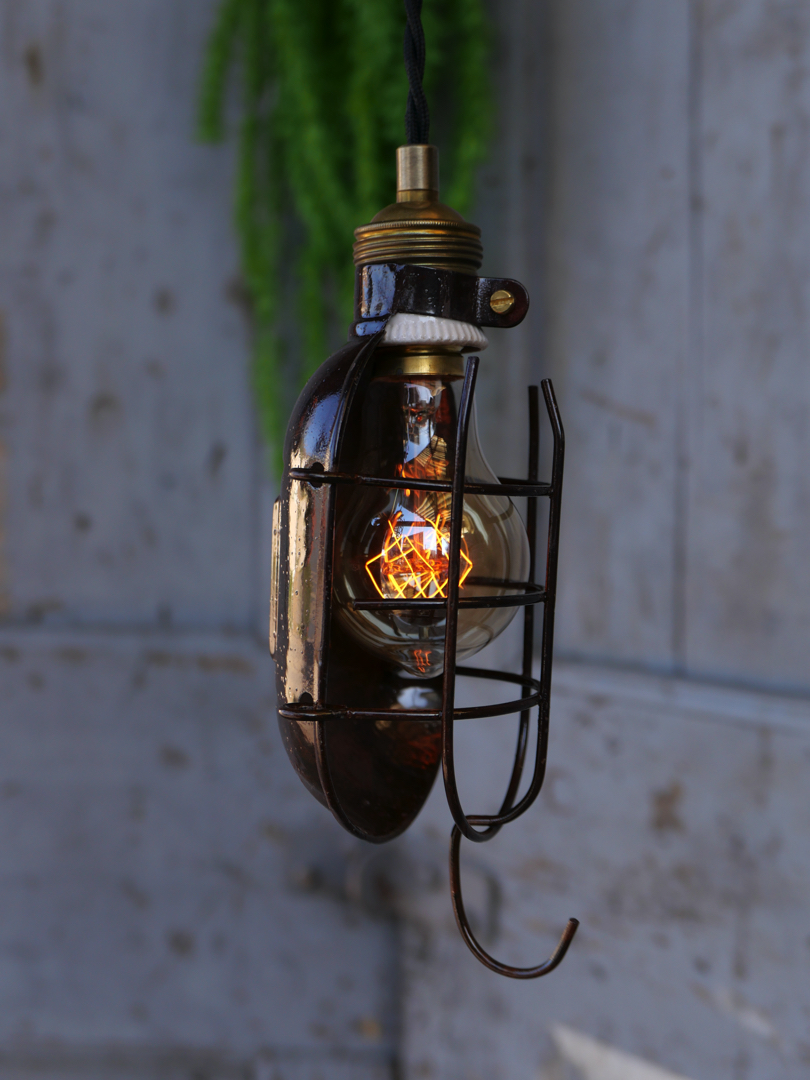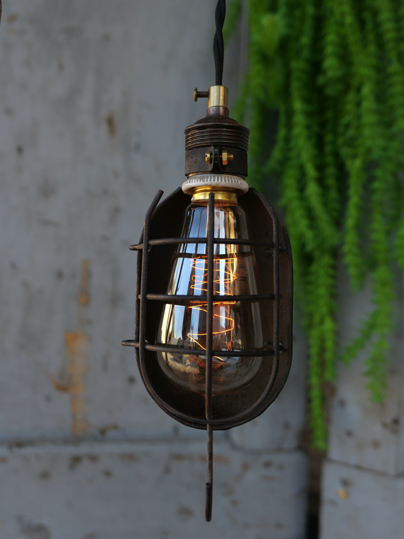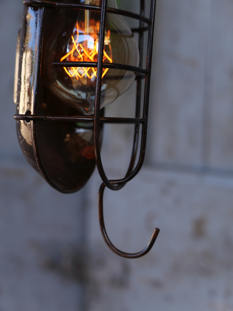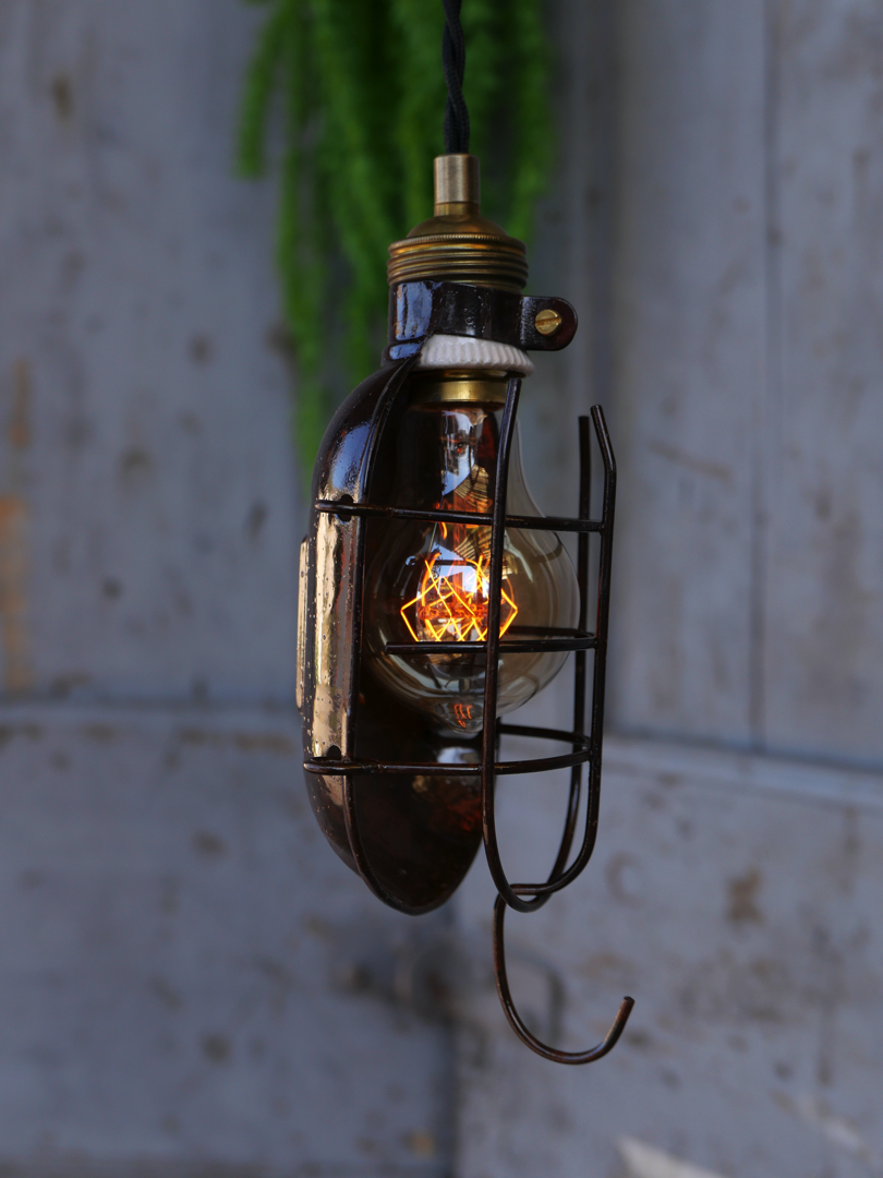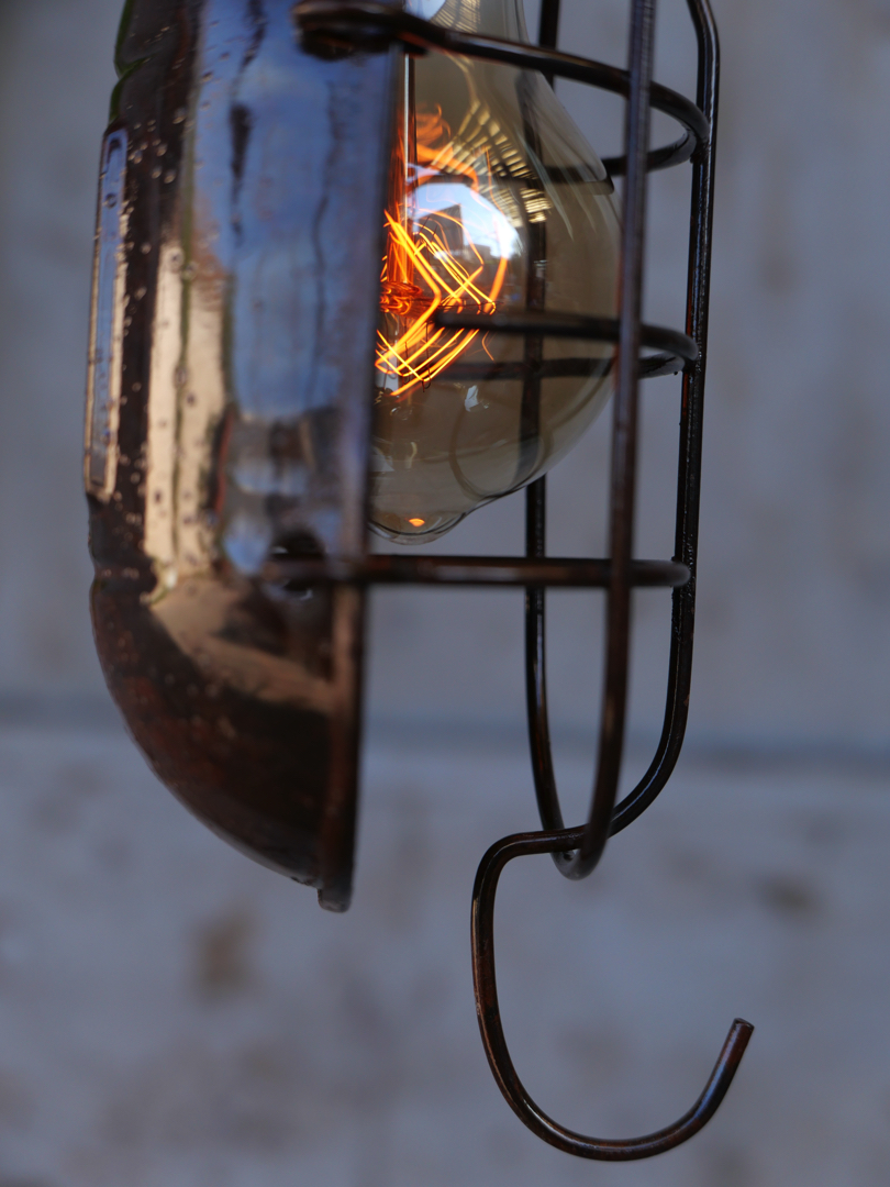 baladeuse industrielle Americaine  la cage en fer s'ouvre et se ferme afin de proteger l'ampoule lors des manipulations un crochet permet de suspendre la baladeuse munie d'une douille a vis standard afin de pouvoir adapter toutes les ampoules actuelles  2 metres de cable tissu hauteur:  cm / diametre: 9 cm ( livré sans ampoule, ces dernieres sont en vente sur le site )