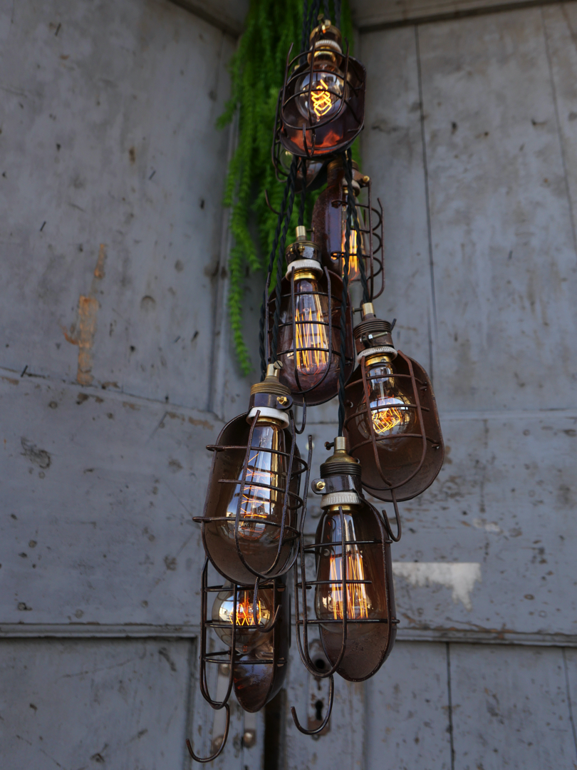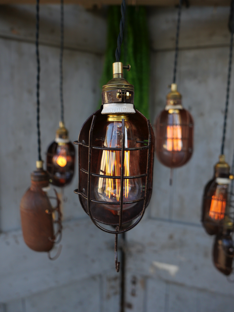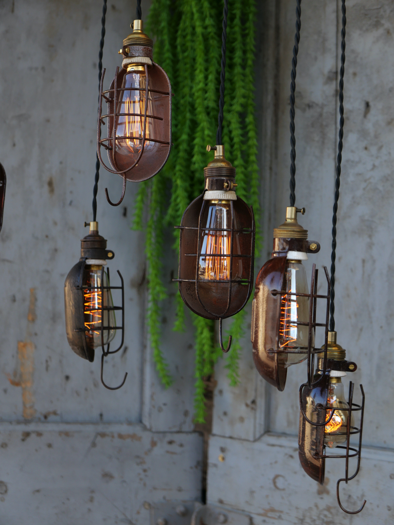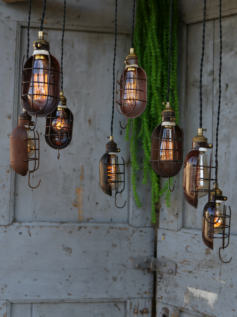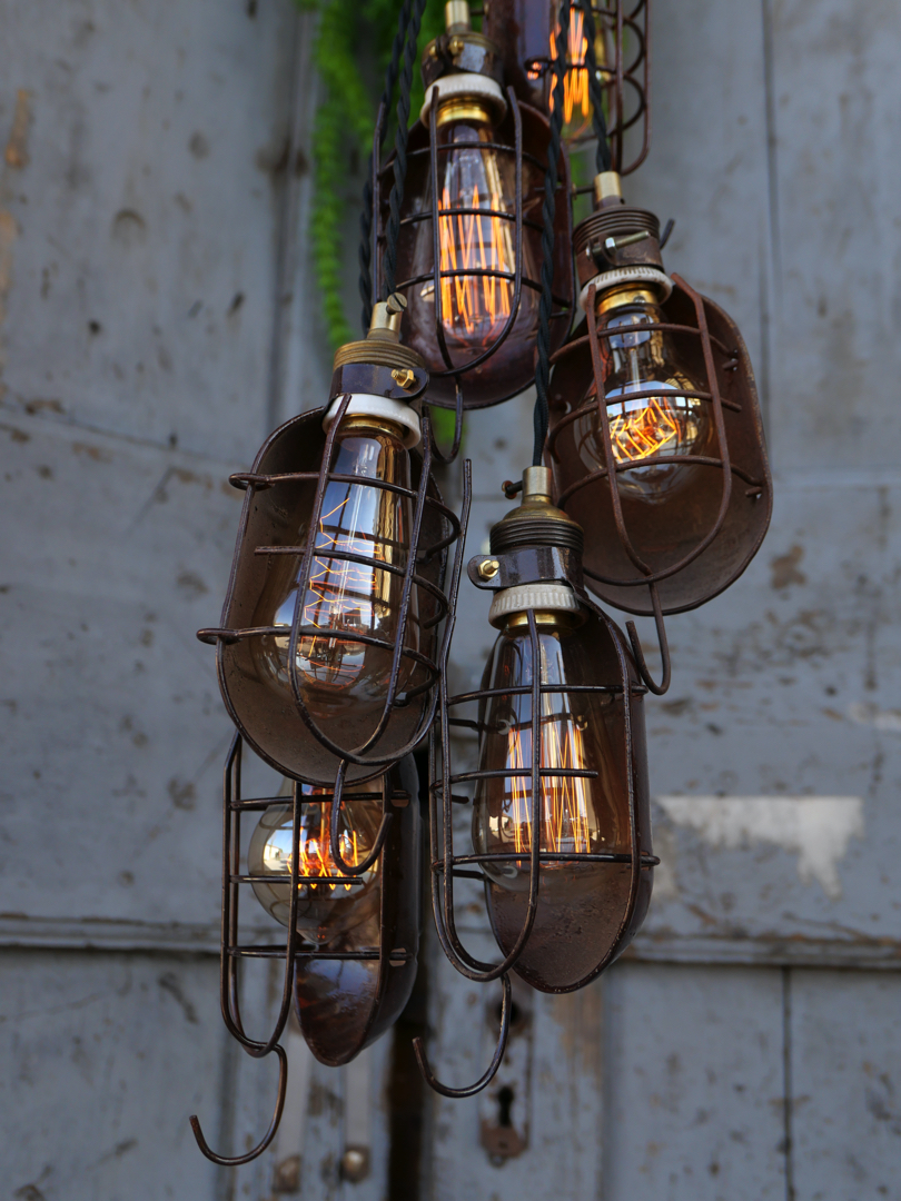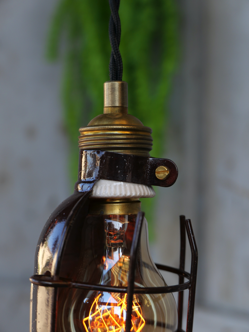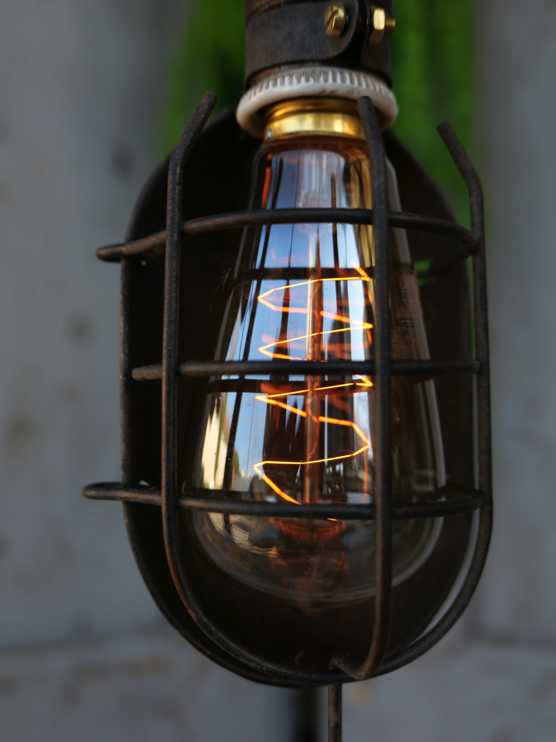 baladeuse industrielle Americaine  la cage en fer s'ouvre et se ferme afin de proteger l'ampoule lors des manipulations un crochet permet de suspendre la baladeuse munie d'une douille a vis standard afin de pouvoir adapter toutes les ampoules actuelles  2 metres de cable tissu hauteur:  cm / diametre: 9 cm ( livré sans ampoule, ces dernieres sont en vente sur le site )