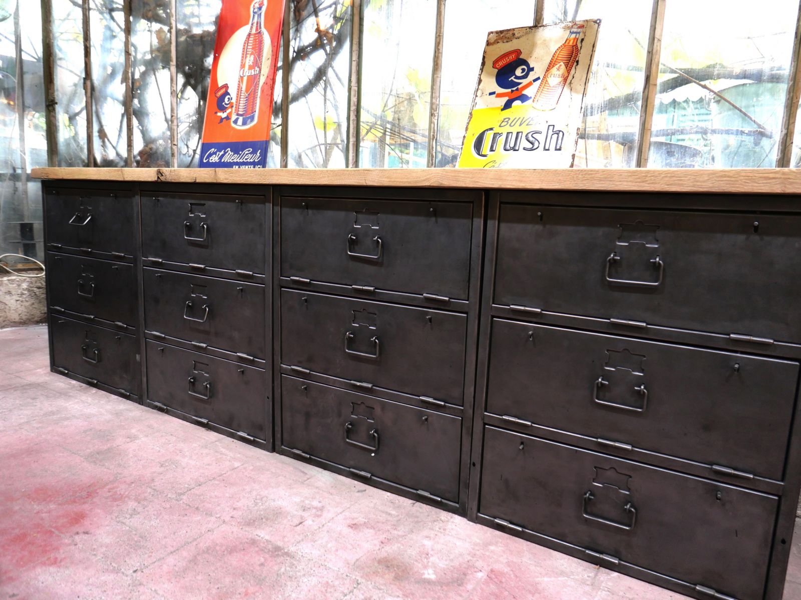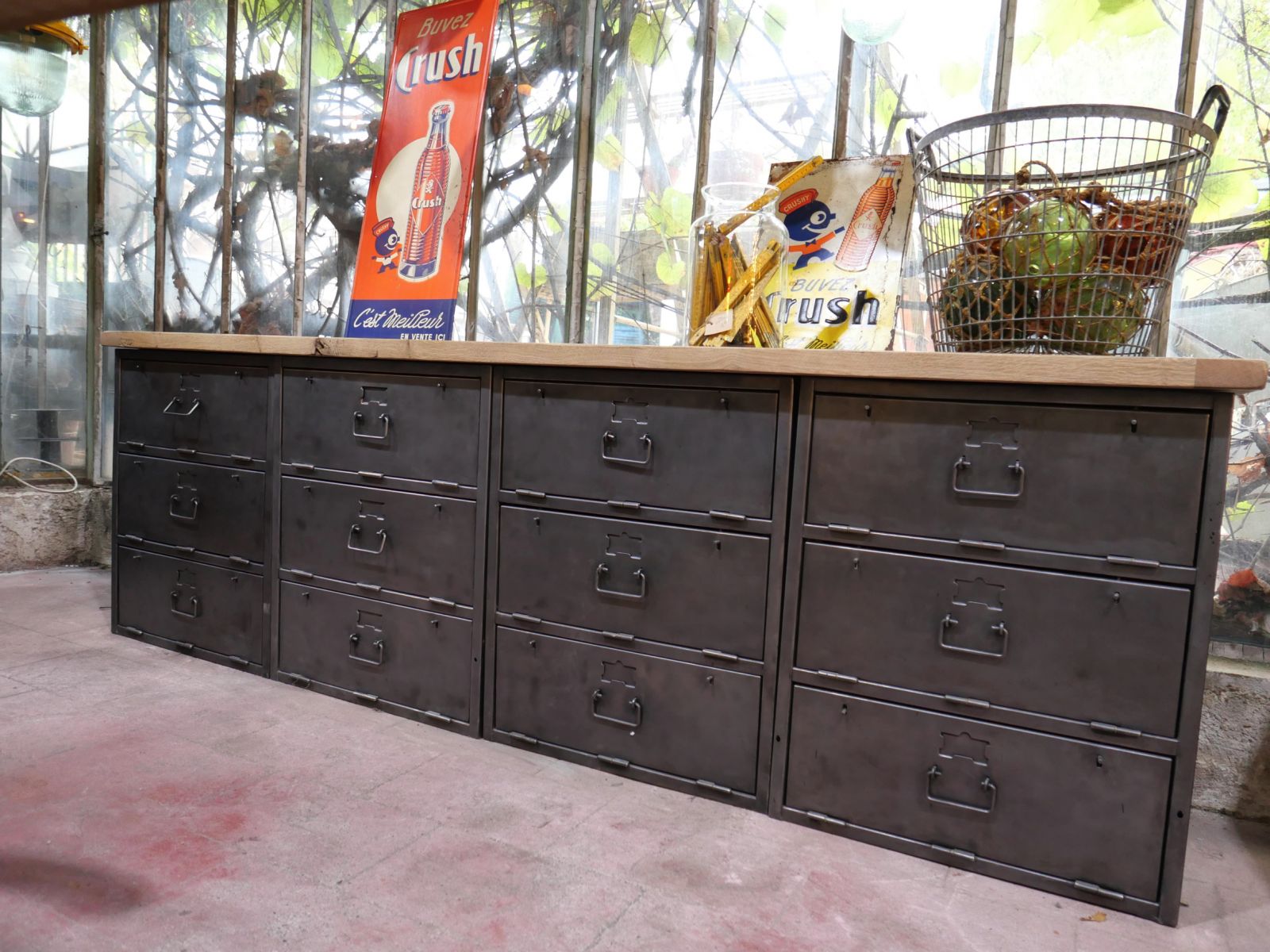 Ancien meuble industriel metal et bois enfilade compose de 4 meubles 12 casiers des années 1960 plateau chene massif Mobilier ideal pour une deco industrielle meuble de rangement Dim: L 245 / H 80 / 46 cm Le metal a été décapé, teinté graphite