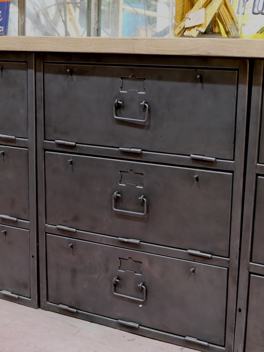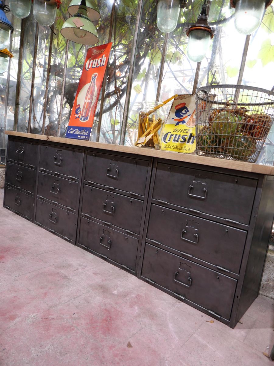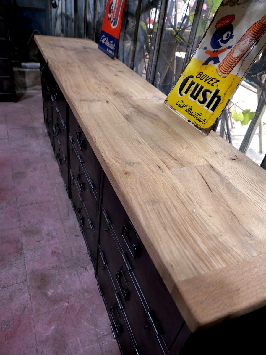 enfilade industrielle 12 compartiments atelier militaire plateau vieux chene massif