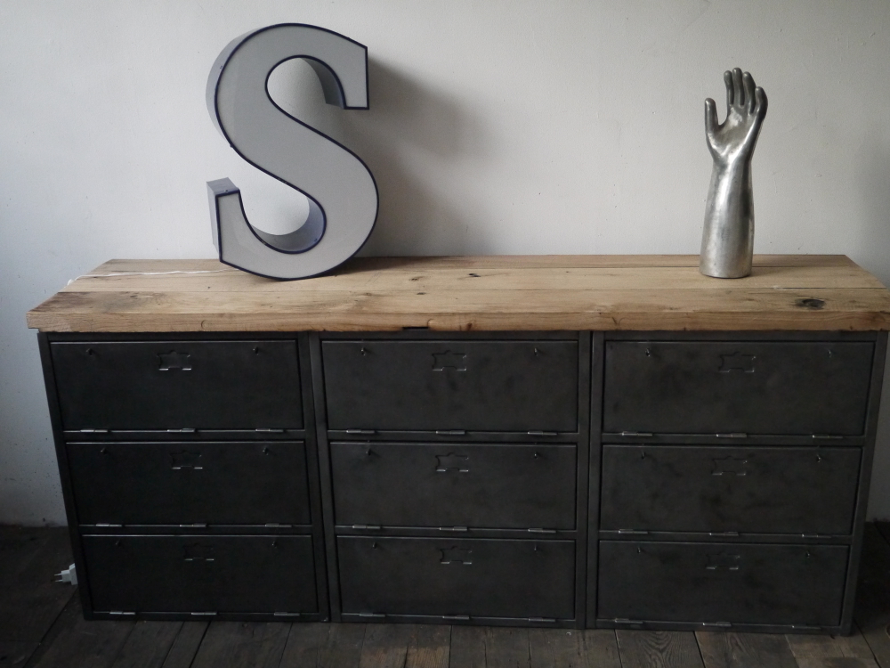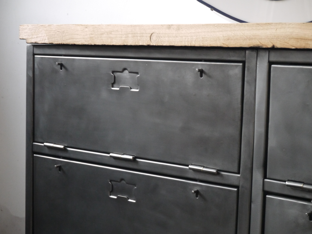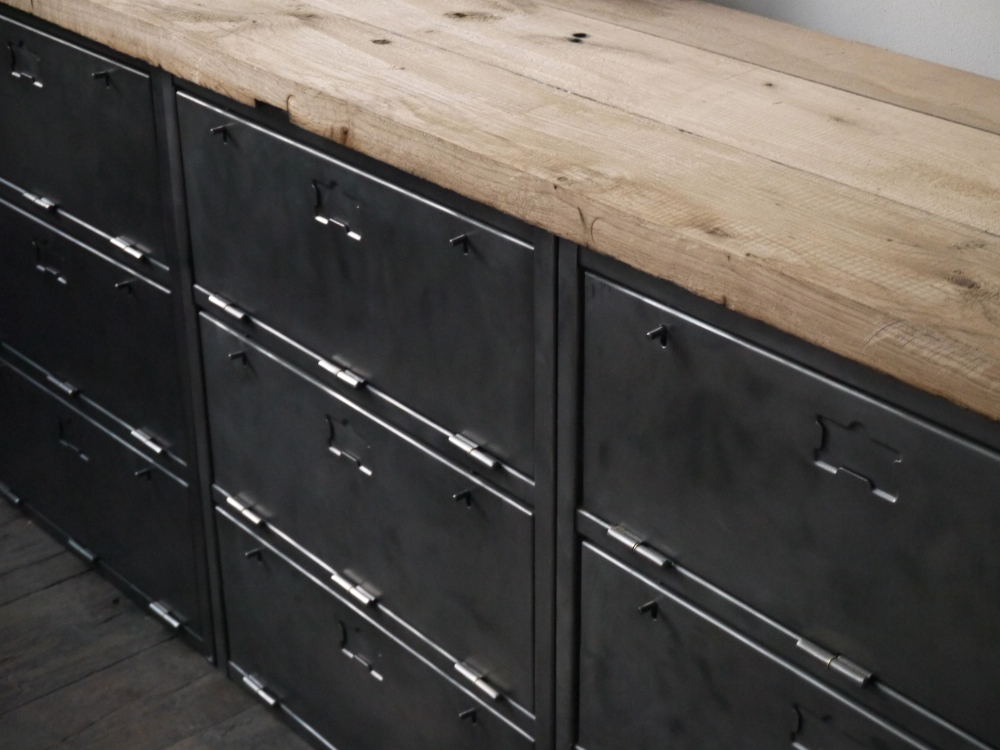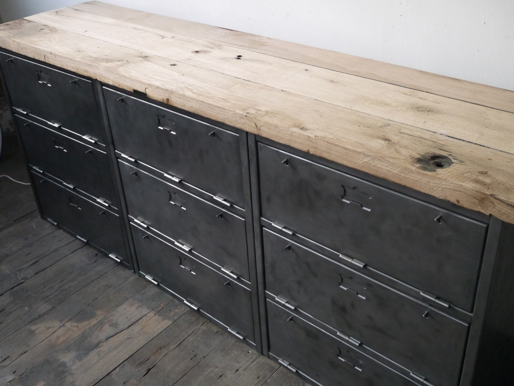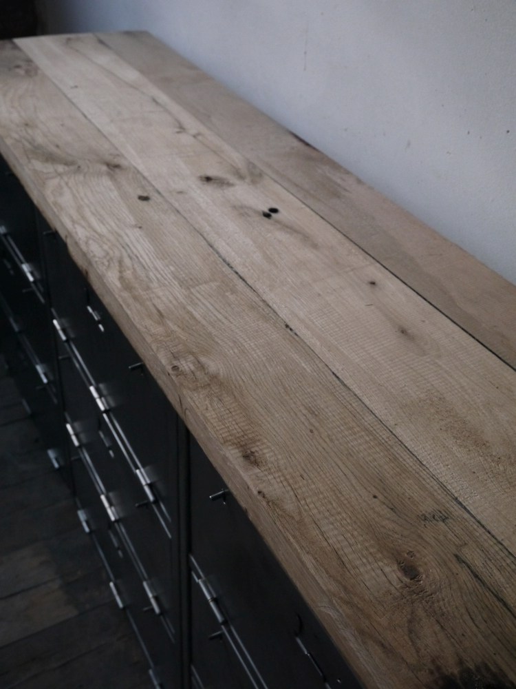enfilade industrielle 9 compartiments atelier militaire plateau vieux chene massif