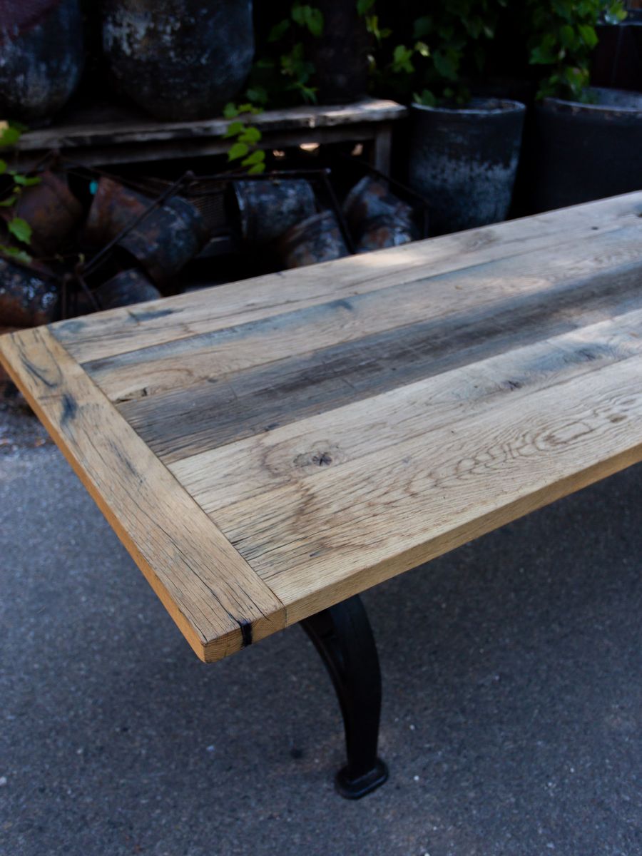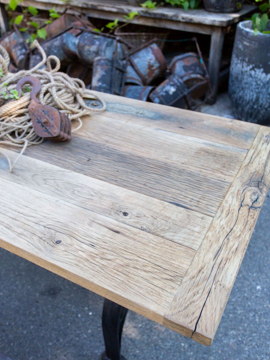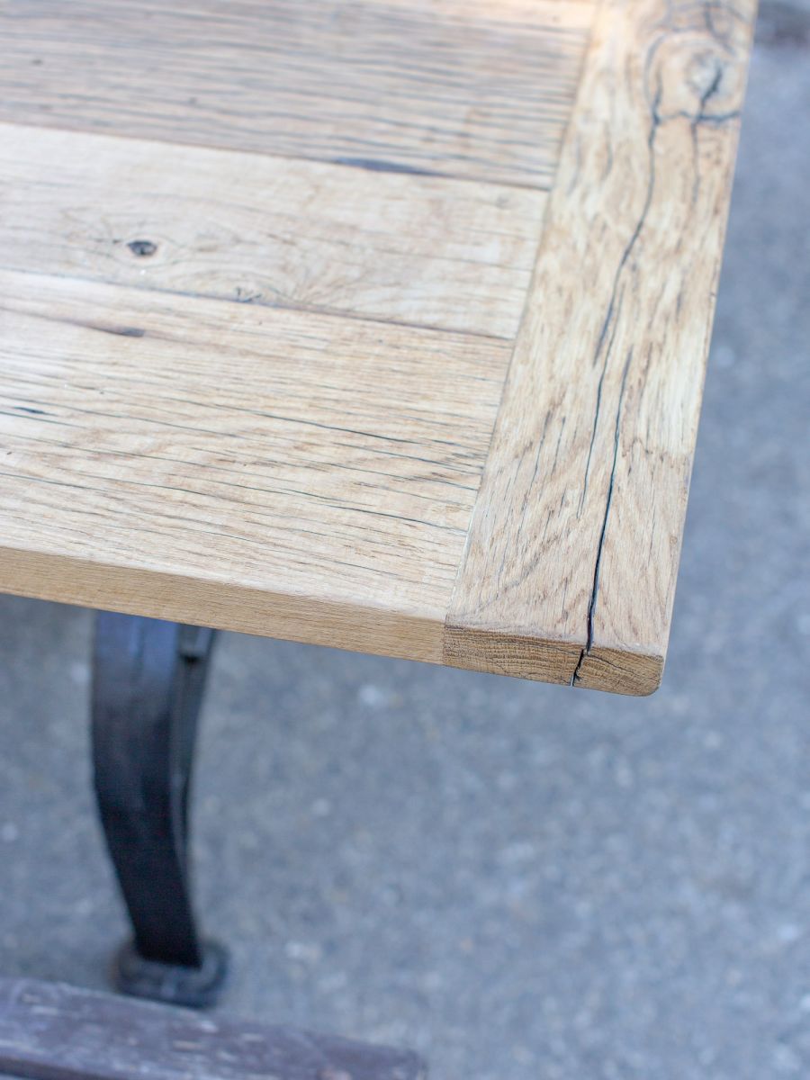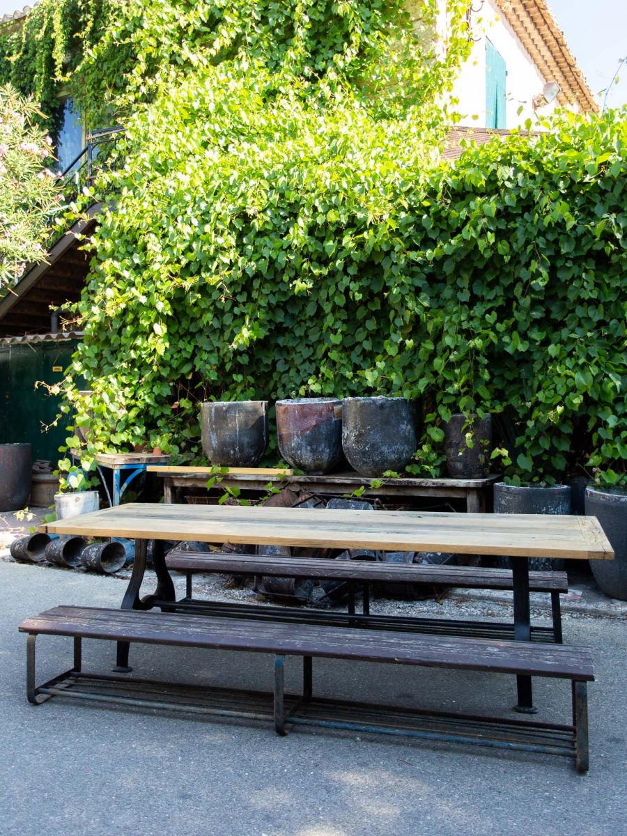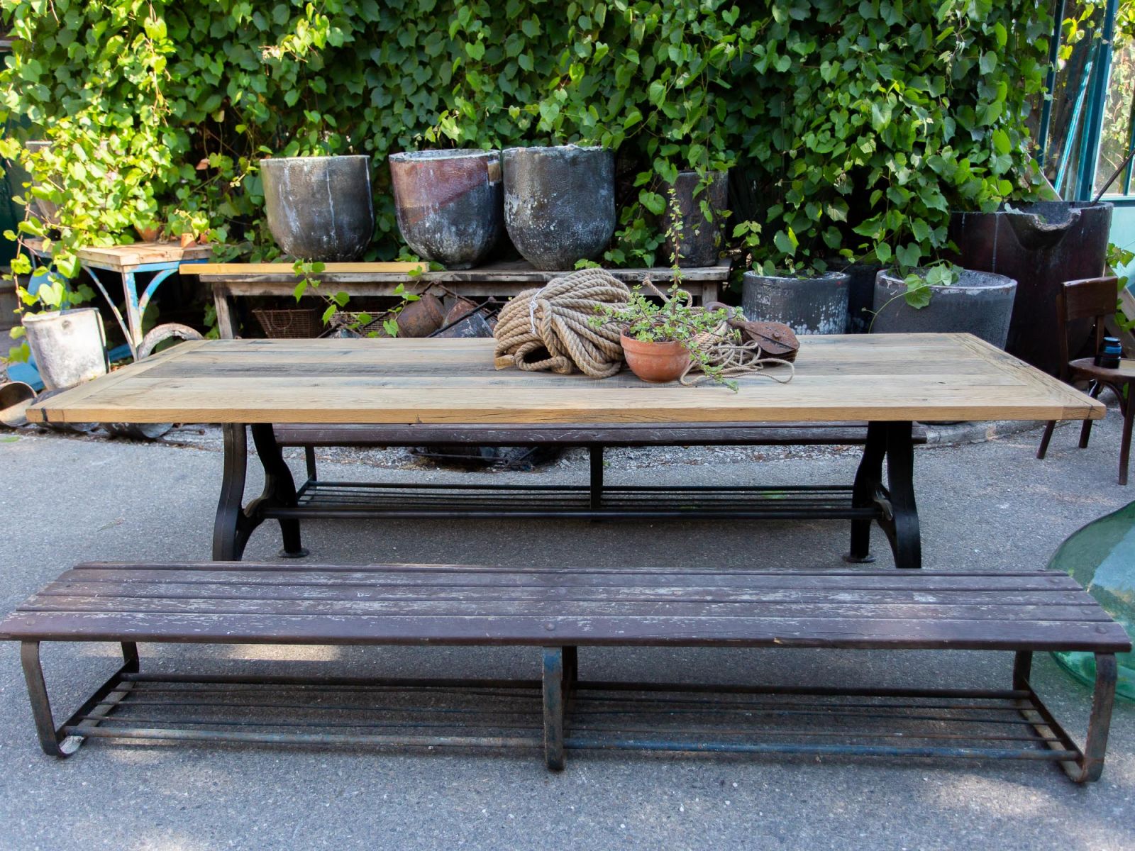 grande table industrielle 8 / 10 perssonnes pietement en fonte plateau en vieux chene massif 5cm d'epaisseur dim 270 / 85 cm haut 76 cm.
