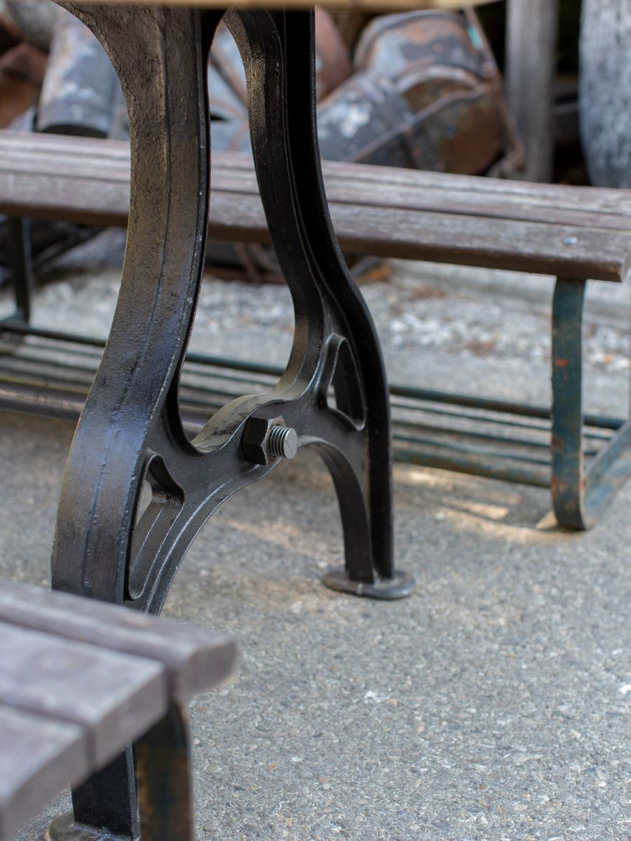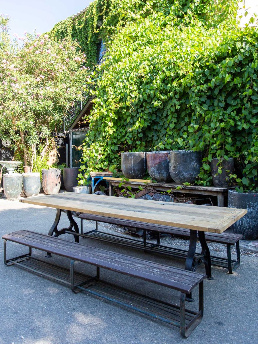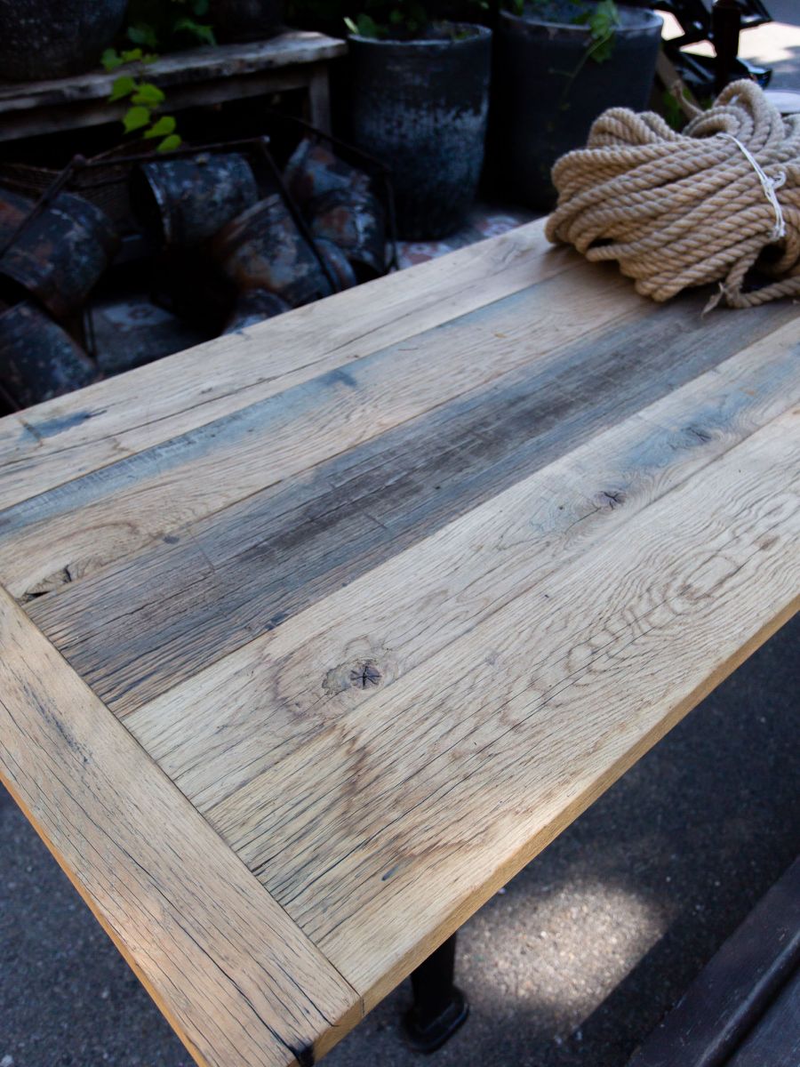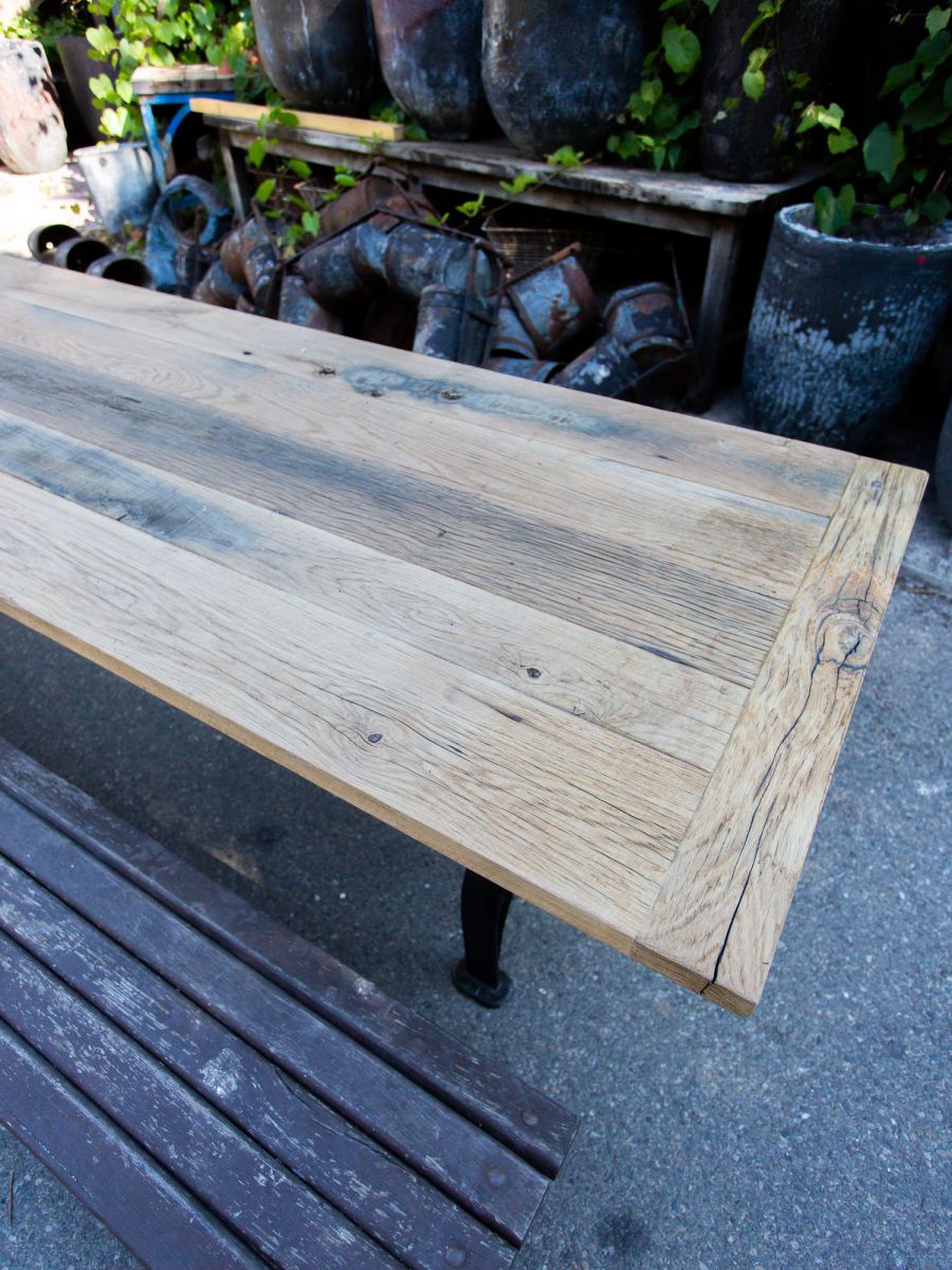 grande table industrielle 8 / 10 perssonnes pietement en fonte plateau en vieux chene massif 5cm d'epaisseur dim 270 / 85 cm haut 76 cm.
