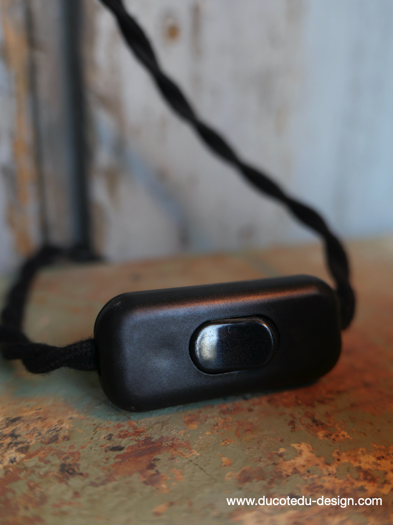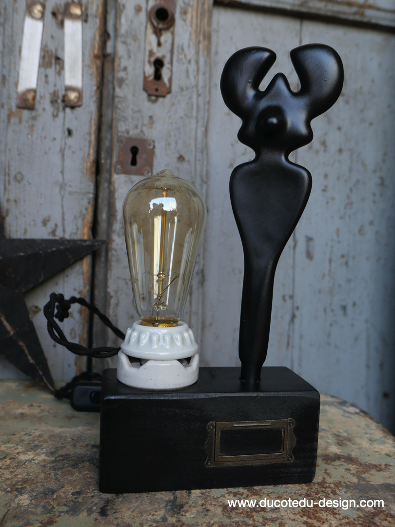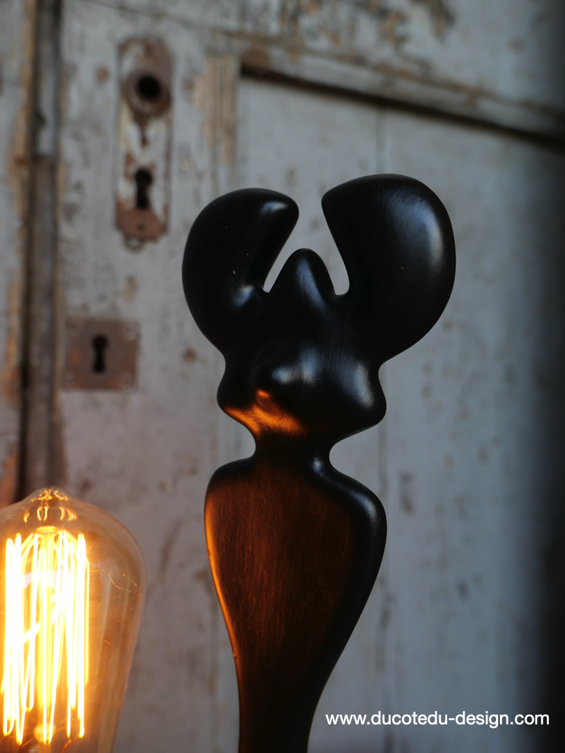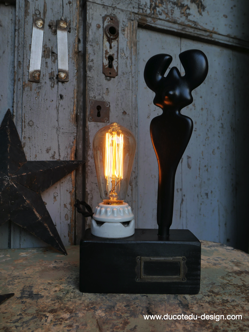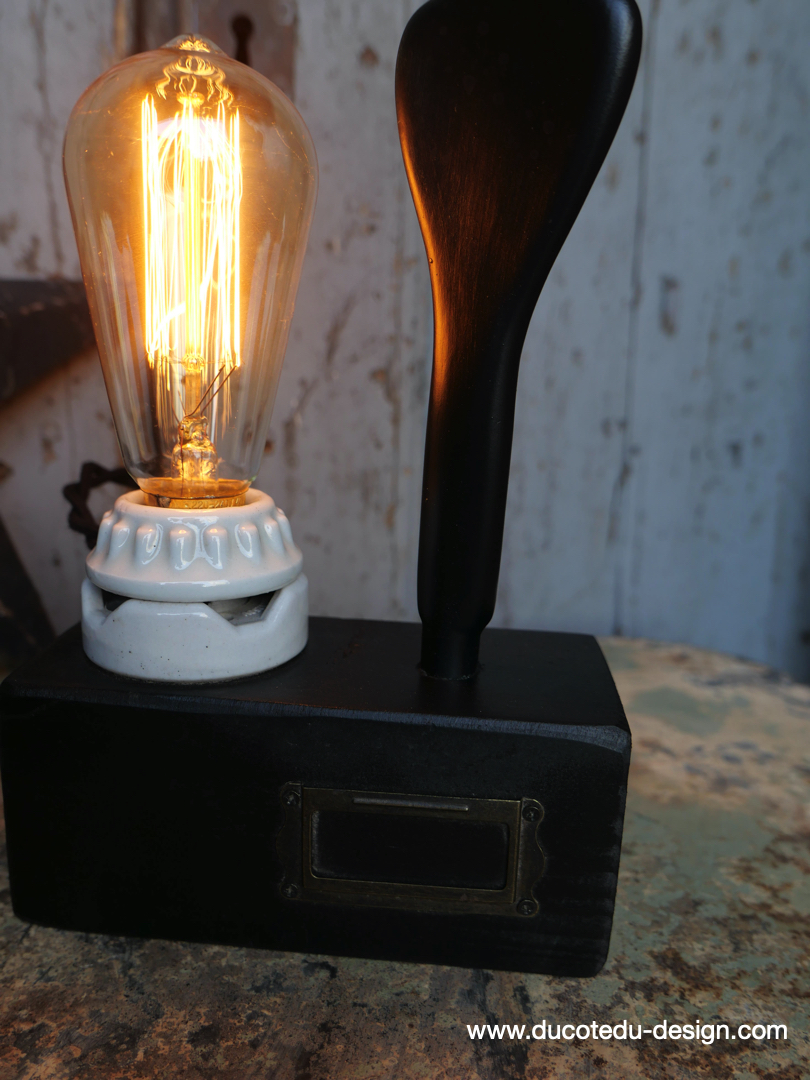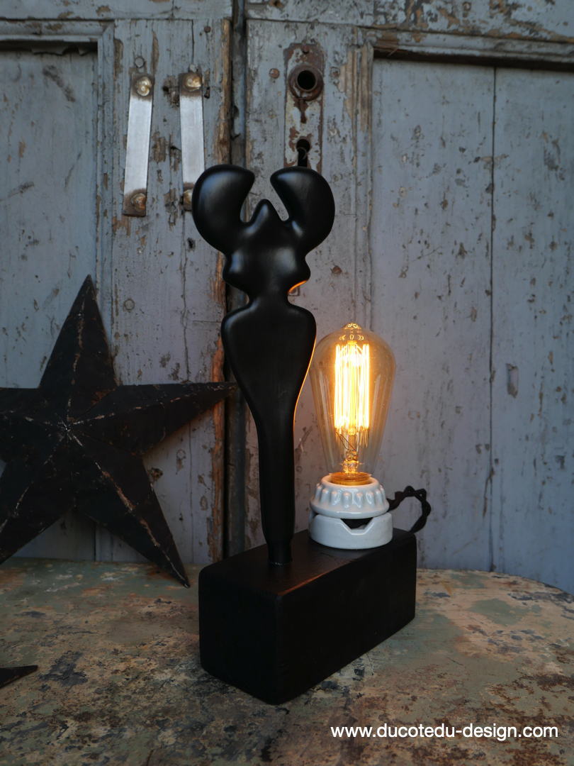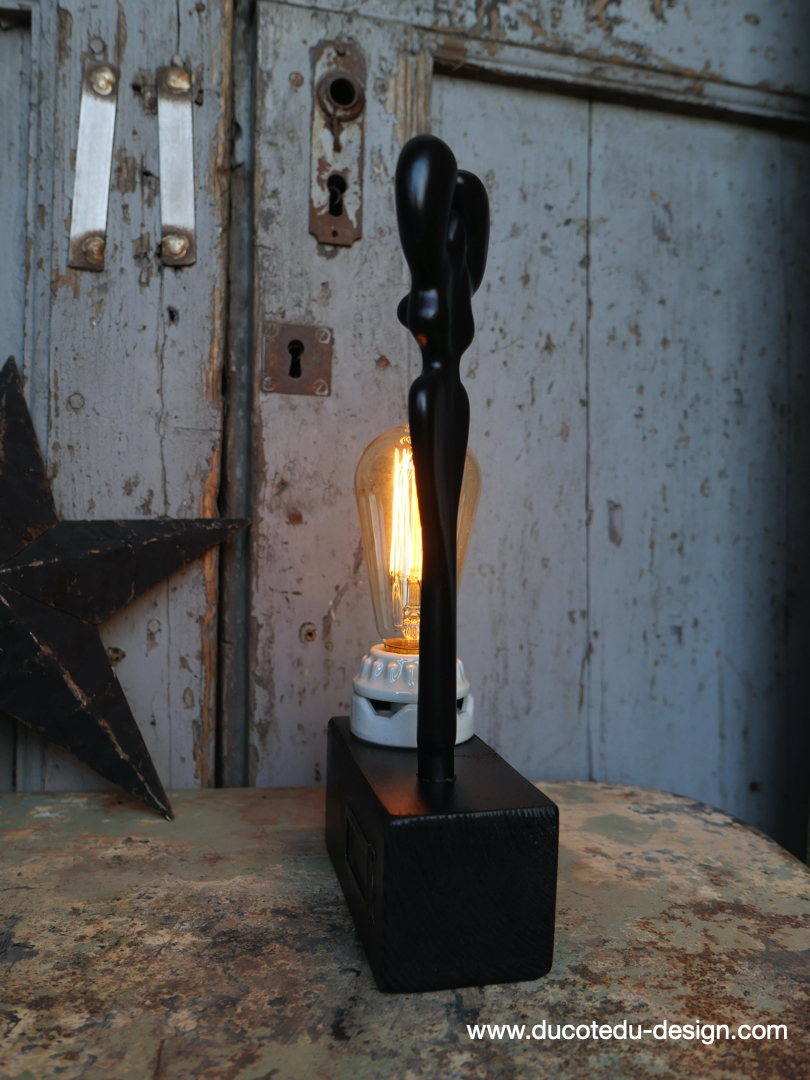 Lampe douille porcelaine, ampoule edison avec moule à ballon de baudruche en porcelaine laqué noir sur socle bois avec interrupteur dim 39 / 15 / 7 cm