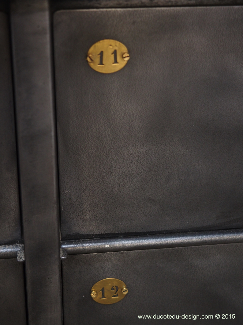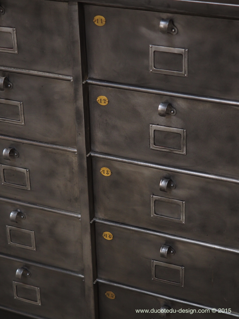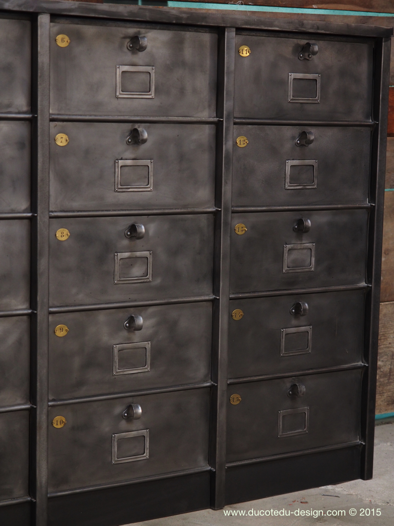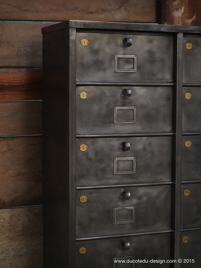 Ancien meuble industriel a clapet strafor 15 casiers, portes etiquette et boutons