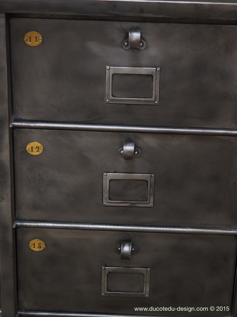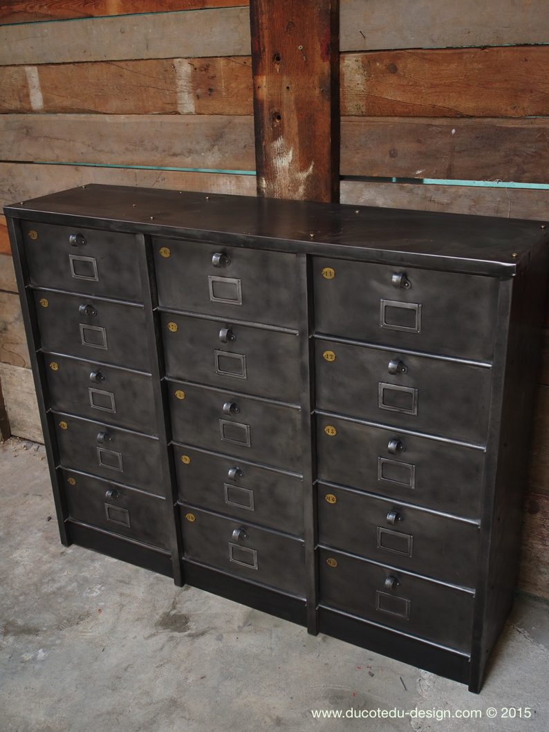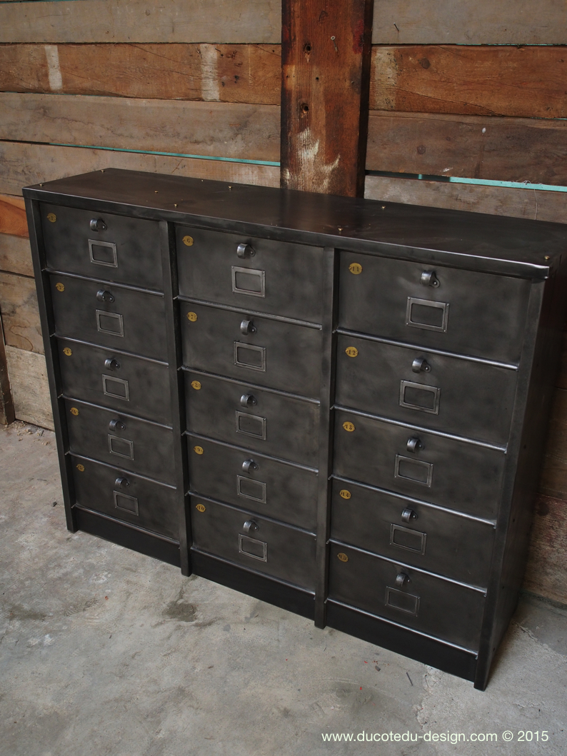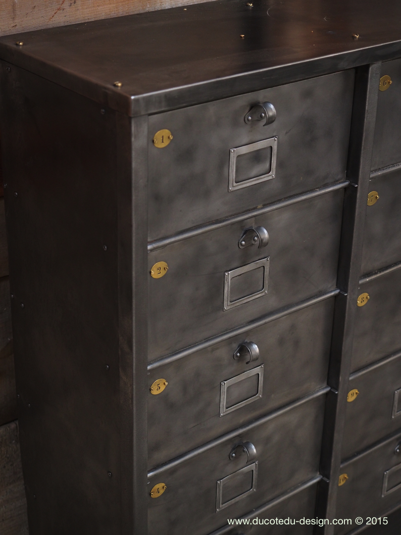 Ancien meuble industriel a clapet strafor 15 casiers, portes etiquette et boutons