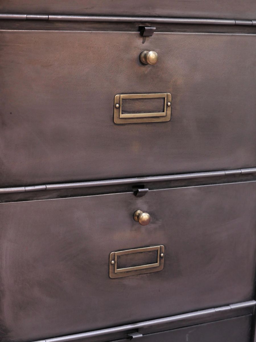 Ancien meuble industriel a clapet Roneo 12 casiers, portes etiquette et boutons laitonnés plateau massif années 1940 / 1950 Mobilier ideal pour une deco industrielle meuble de rangement / tri metallique aux lignes tres pures longeur 128 / hauteur 88 cm / profondeur 35 cm Le metal a été décapé, teinté graphite Forfait livraison à votre domicile par transporteur