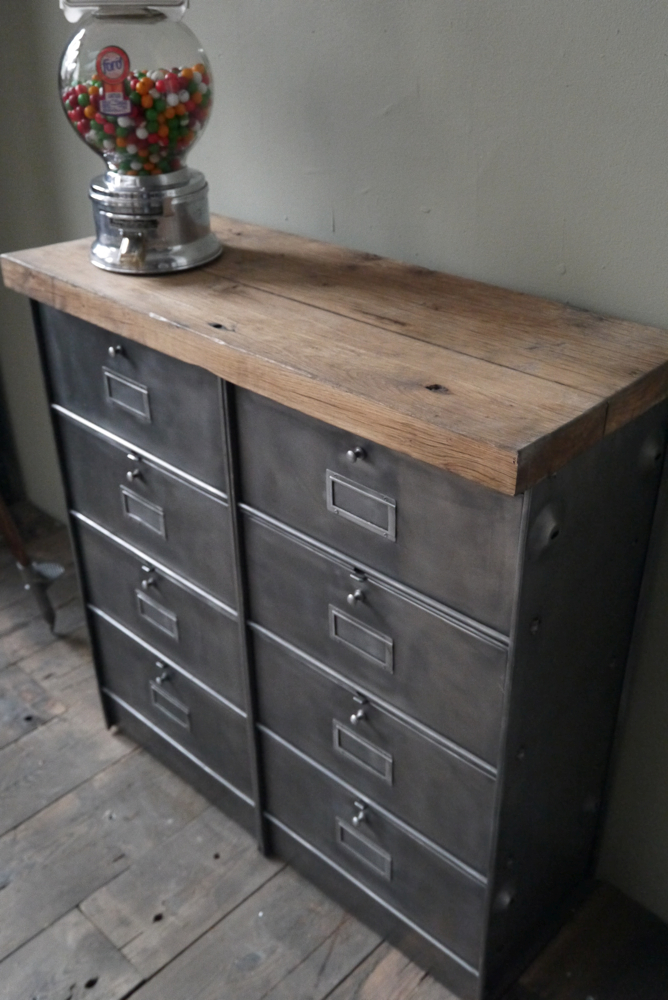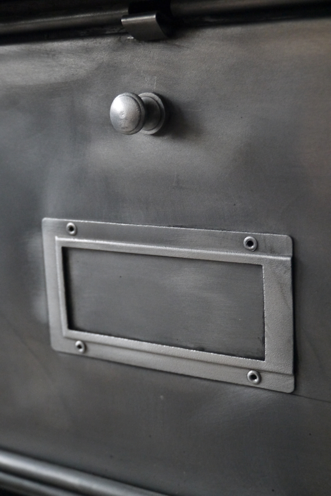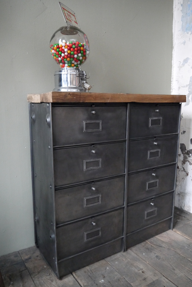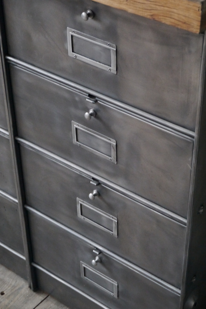 Ancien meuble industriel a clapet Roneo 8 casiers, portes etiquette et boutons plateau massif années 1950 / 1960 Mobilier ideal pour une deco industrielle meuble de rangement / tri metallique aux lignes tres pures haut 89 cm. largeur 88 profondeur 33cm. Le metal a été décapé, teinté graphite et  traité contre la corrosion Forfait livraison à votre domicile par transporteur pour la France metropolitaine 85 euros