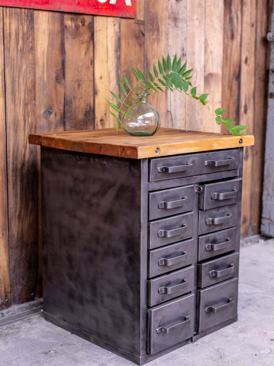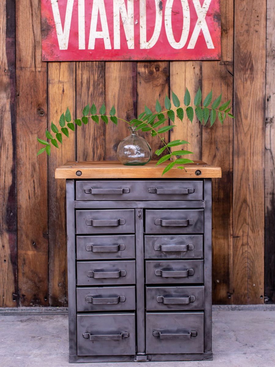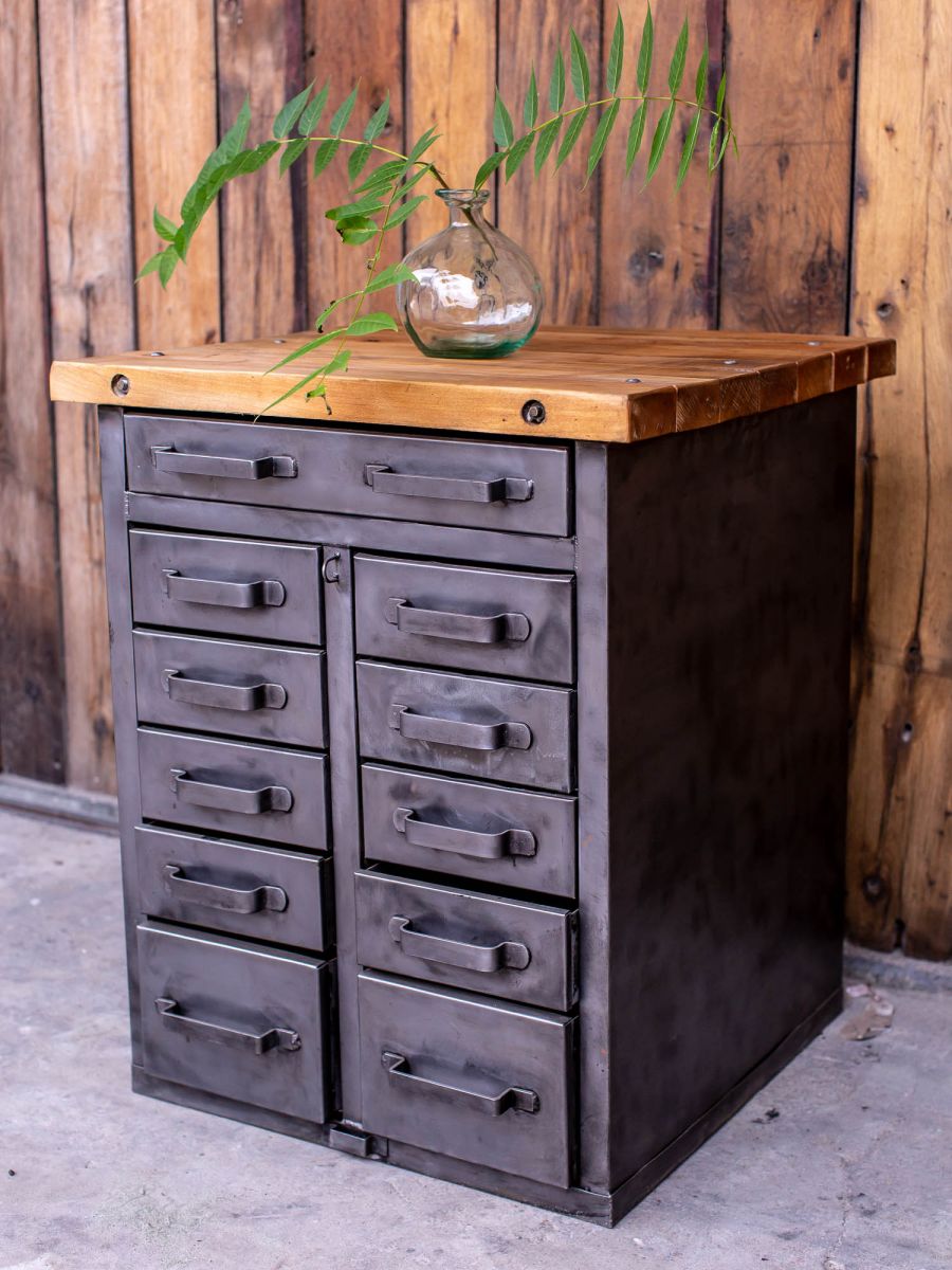 Ancien meuble Militaire console métal plateau vieux chêne massif des années 1950 Mobilier ideal pour une deco industrielle meuble de rangement 11 tiroirs Le metal a été décapé, teinté graphite et traité contre la corrosion Forfait livraison à votre domicile par transporteur pour la France metropolitaine