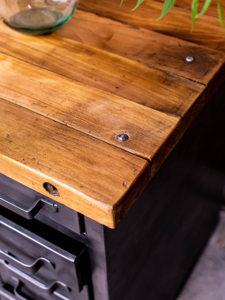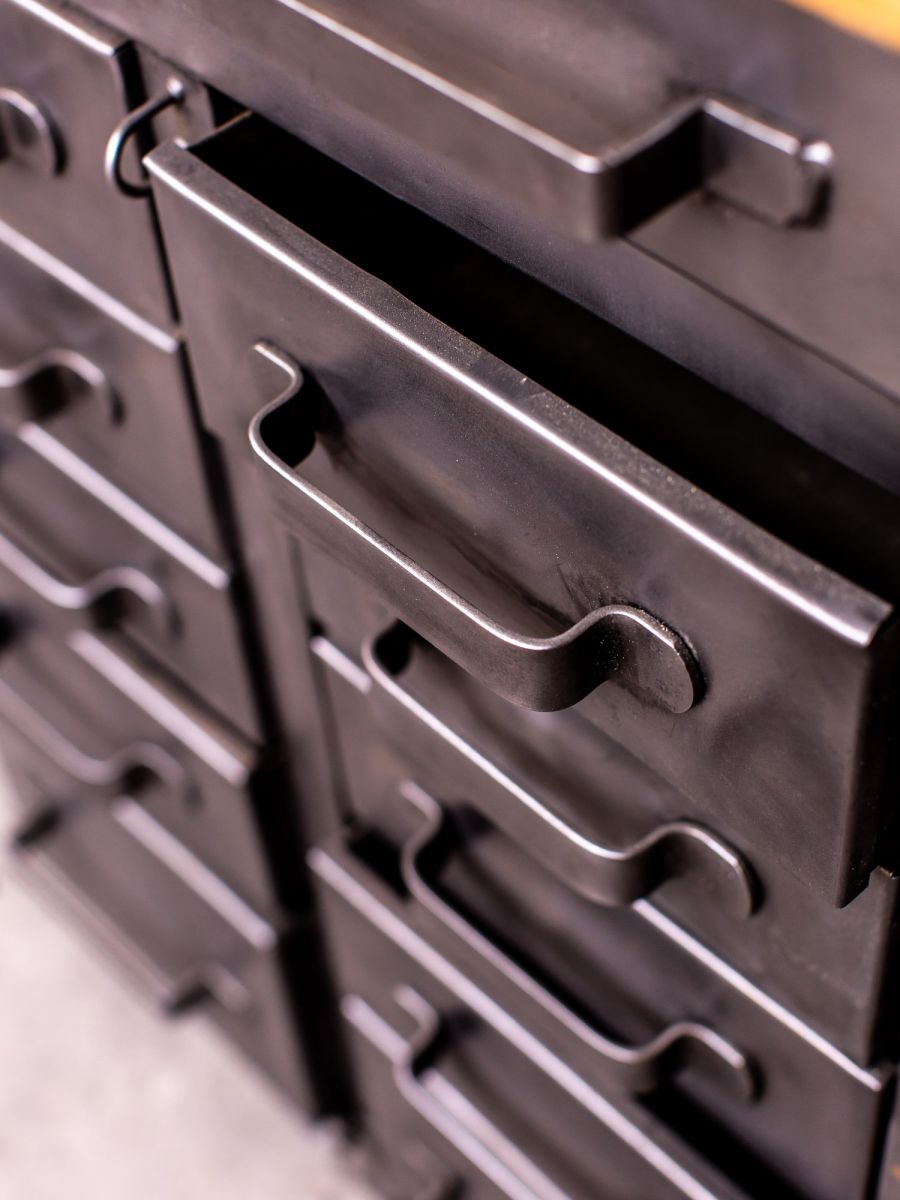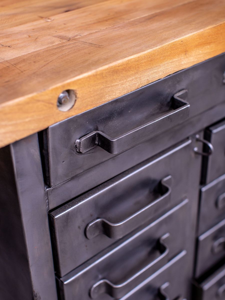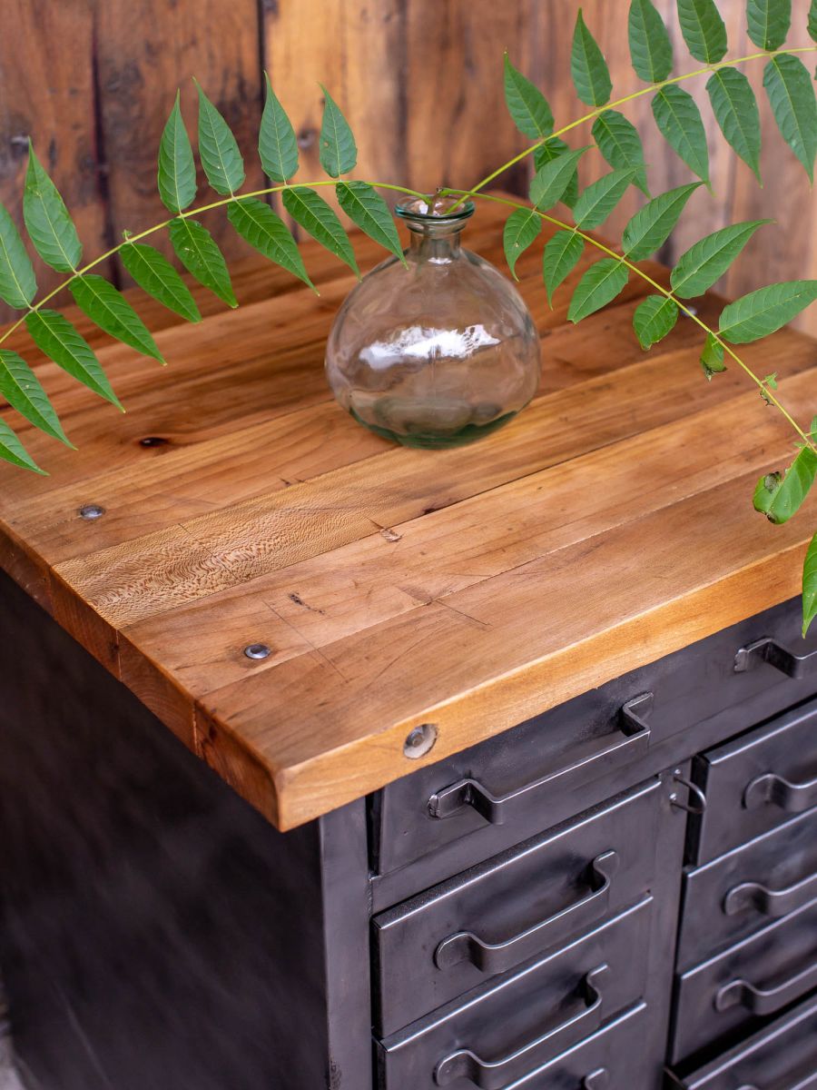 Ancien meuble Militaire console métal plateau vieux chêne massif des années 1950 Mobilier ideal pour une deco industrielle meuble de rangement 11 tiroirs Le metal a été décapé, teinté graphite et traité contre la corrosion Forfait livraison à votre domicile par transporteur pour la France metropolitaine