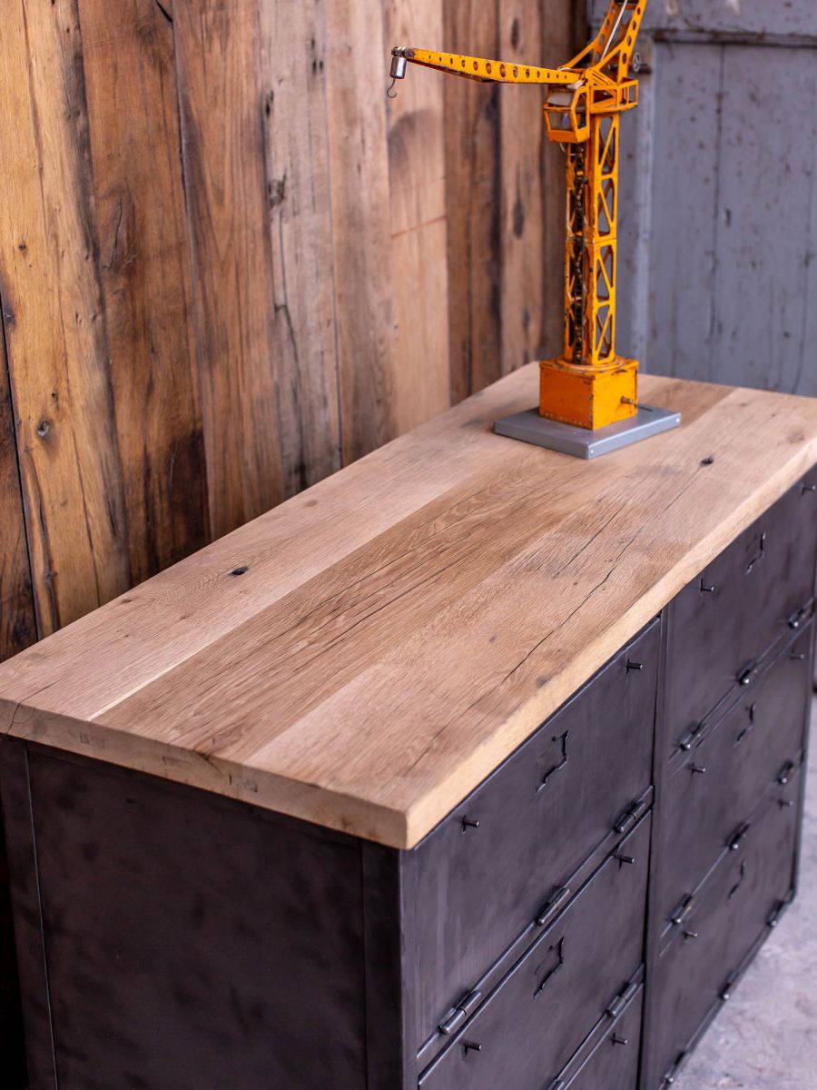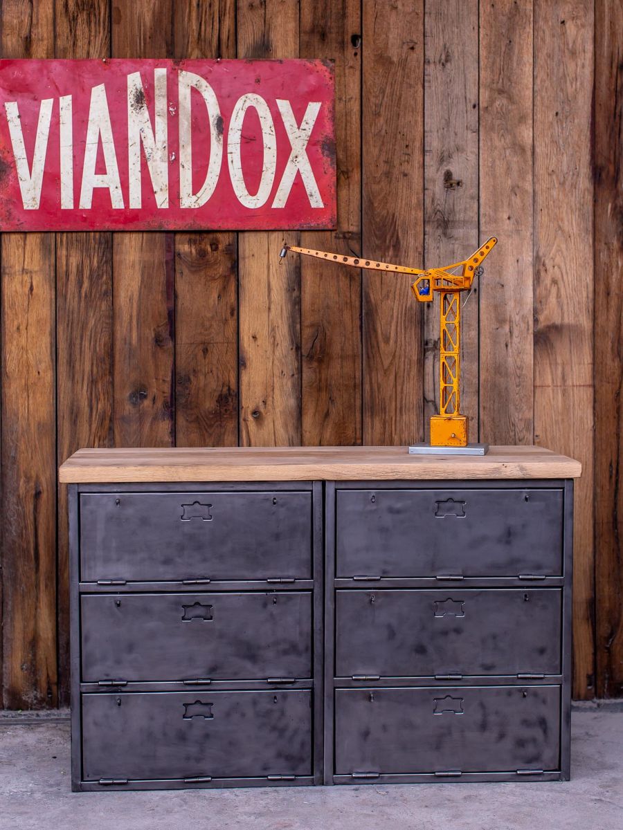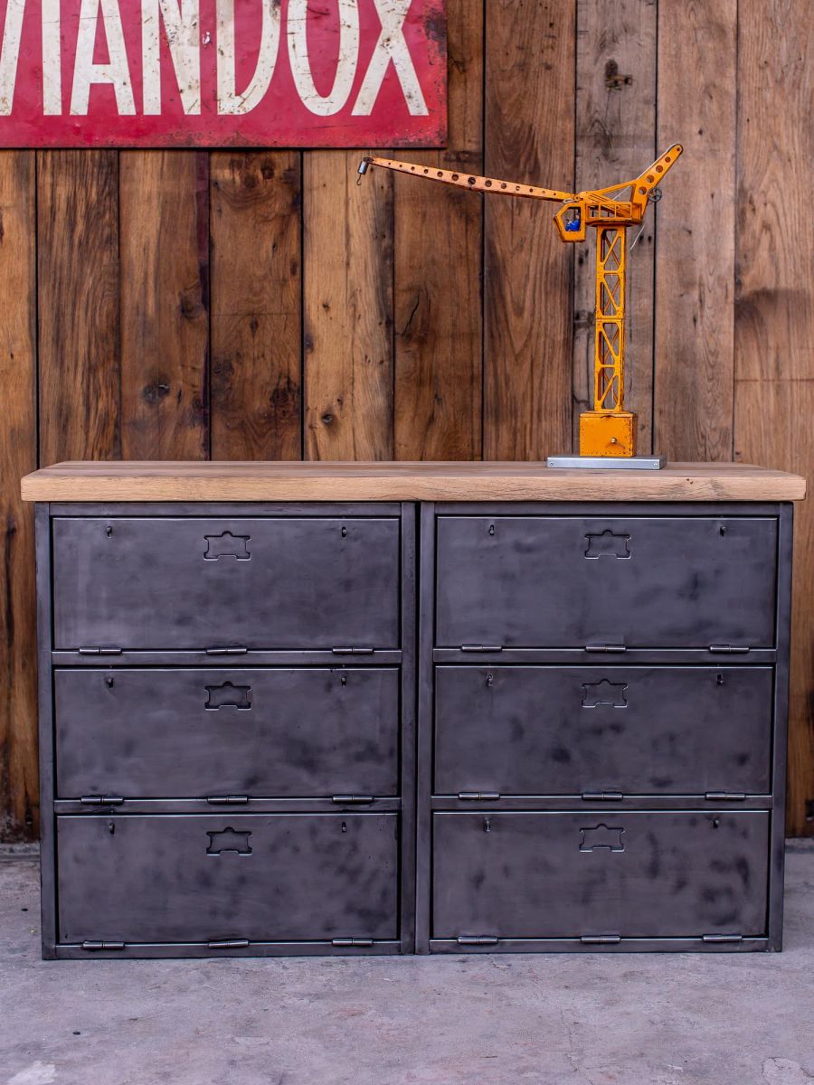 Ancien meuble Militaire console métal plateau vieux chêne massif des années 1950 Mobilier ideal pour une deco industrielle 6 tiroirs L 120 / H 80 / P 46 cm Le metal a été décapé, teinté graphite et traité contre la corrosion Forfait livraison à votre domicile par transporteur pour la France metropolitaine