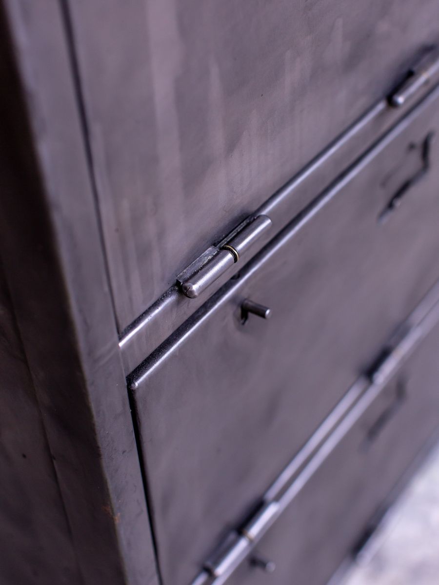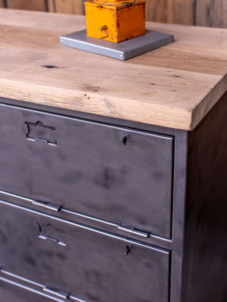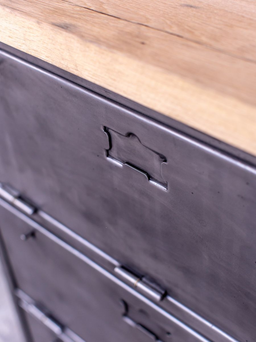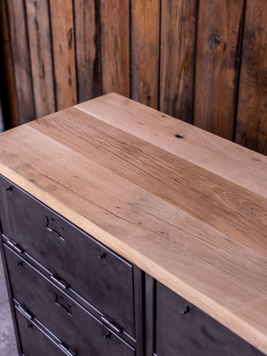 Ancien meuble Militaire console métal plateau vieux chêne massif des années 1950 Mobilier ideal pour une deco industrielle 6 tiroirs L 120 / H 80 / P 46 cm Le metal a été décapé, teinté graphite et traité contre la corrosion Forfait livraison à votre domicile par transporteur pour la France metropolitaine
