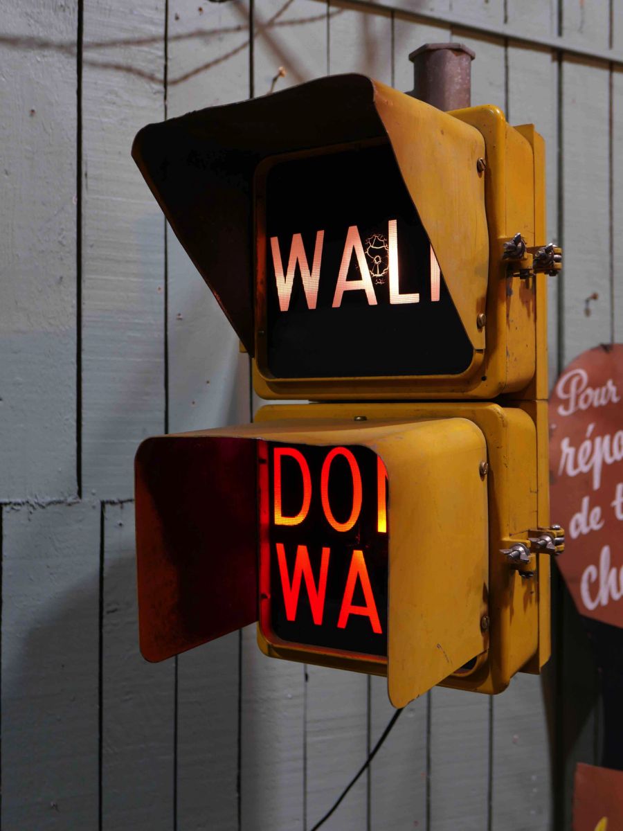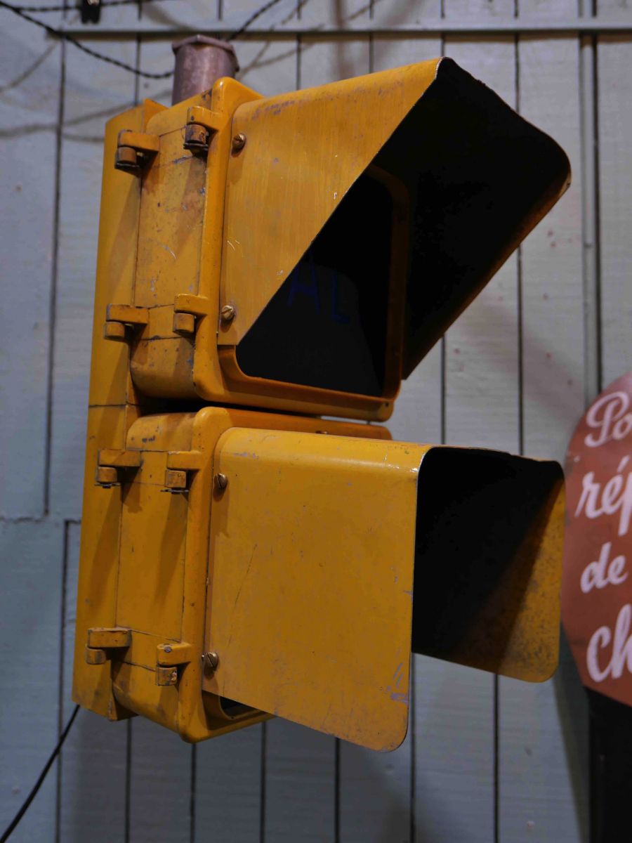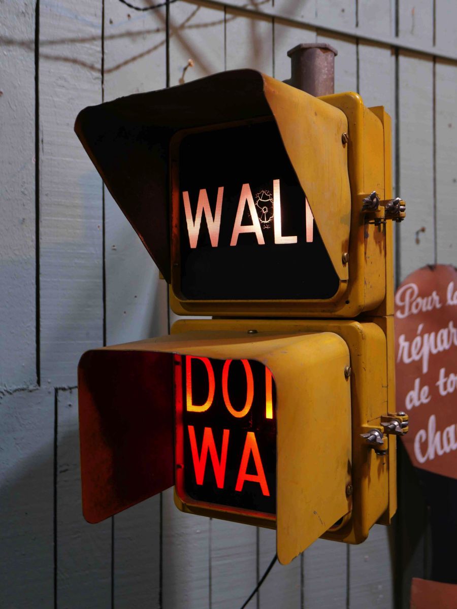 ◊ feu dont walk americain vintage USA jaune d'origine dans son jus eletricite en 220 v / ampoules 60 w de la ville de New York magnifique objet de déco peinture jaune d'origine fixations murale / casquettes Dimensions : H: 70 / L: 50 / P: 40 cm