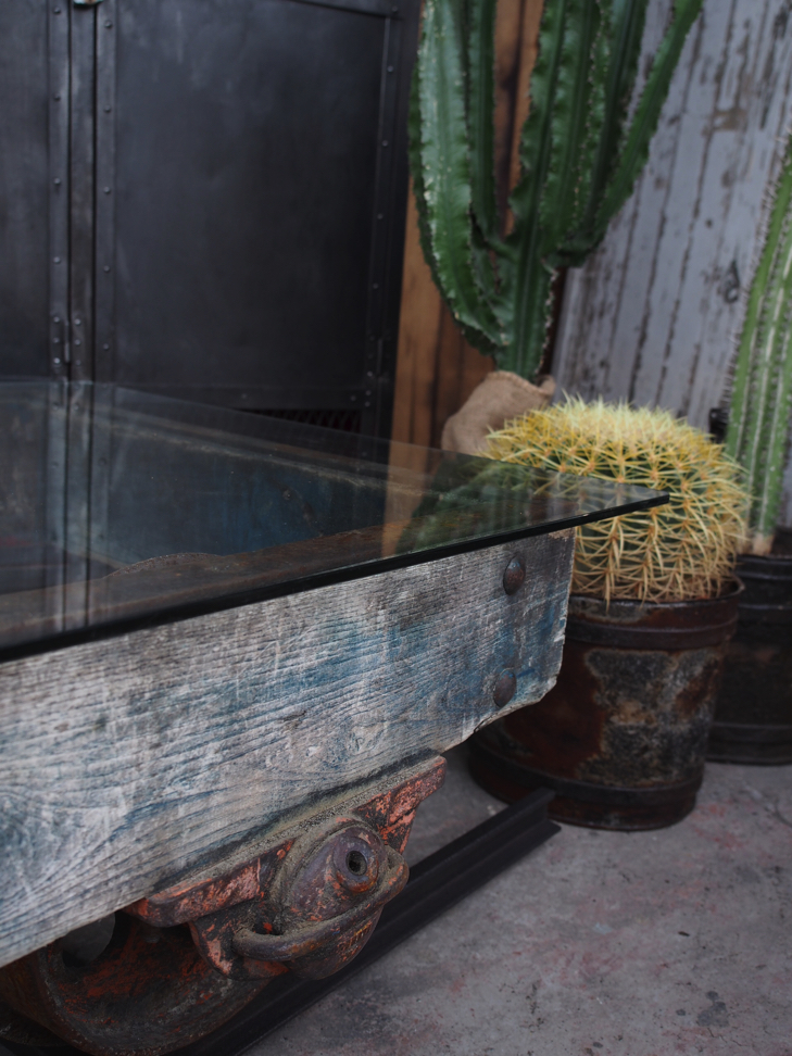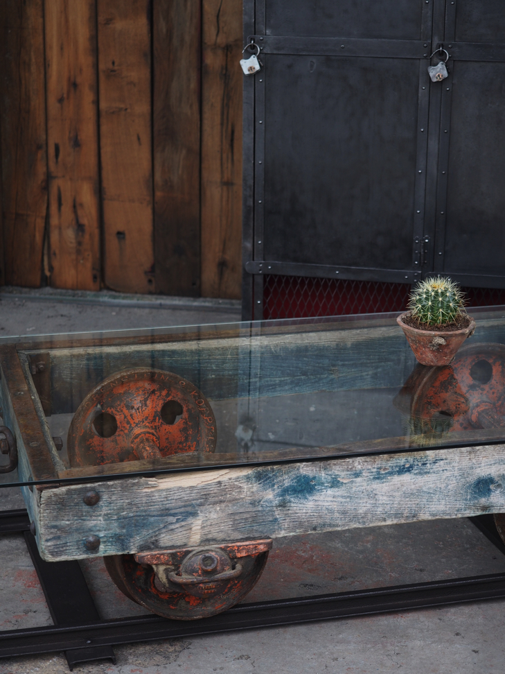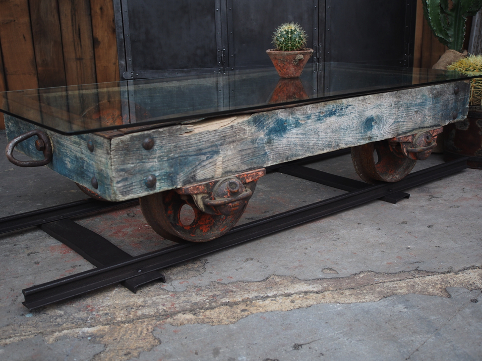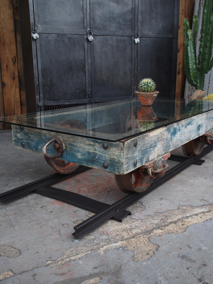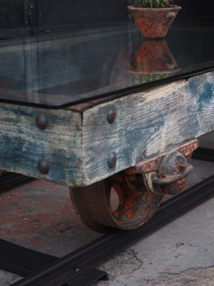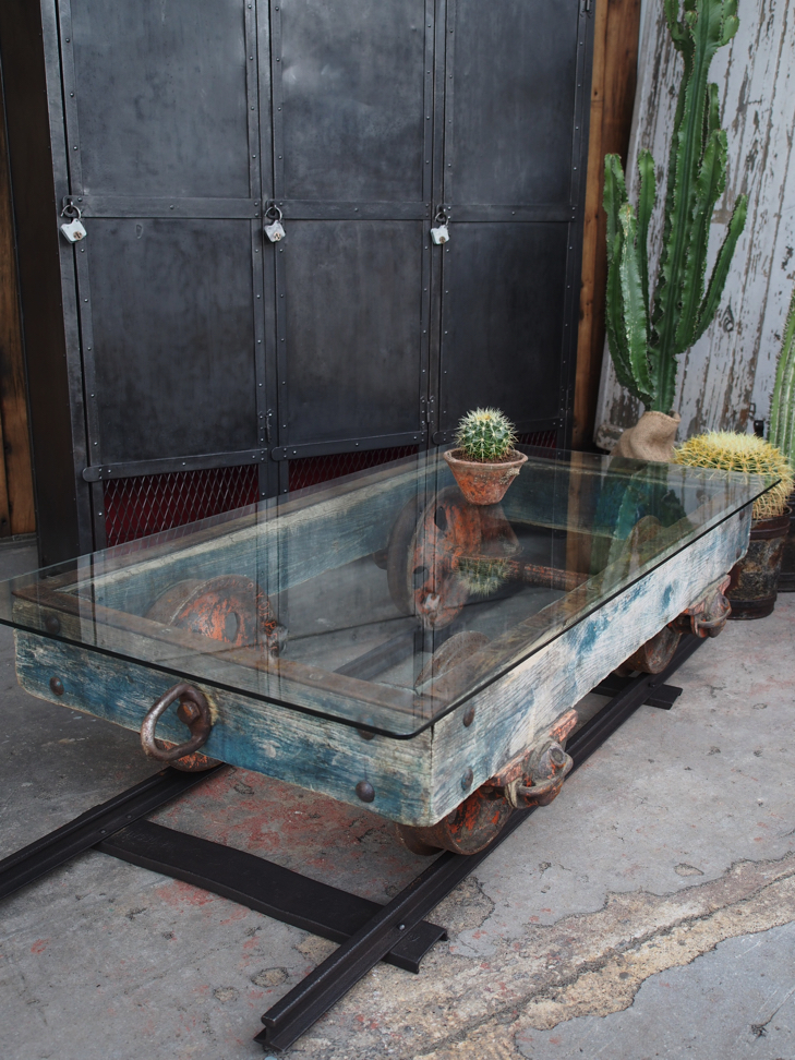 Table basse metal et bois industrielle wagon de mine sur rail plateau de verre