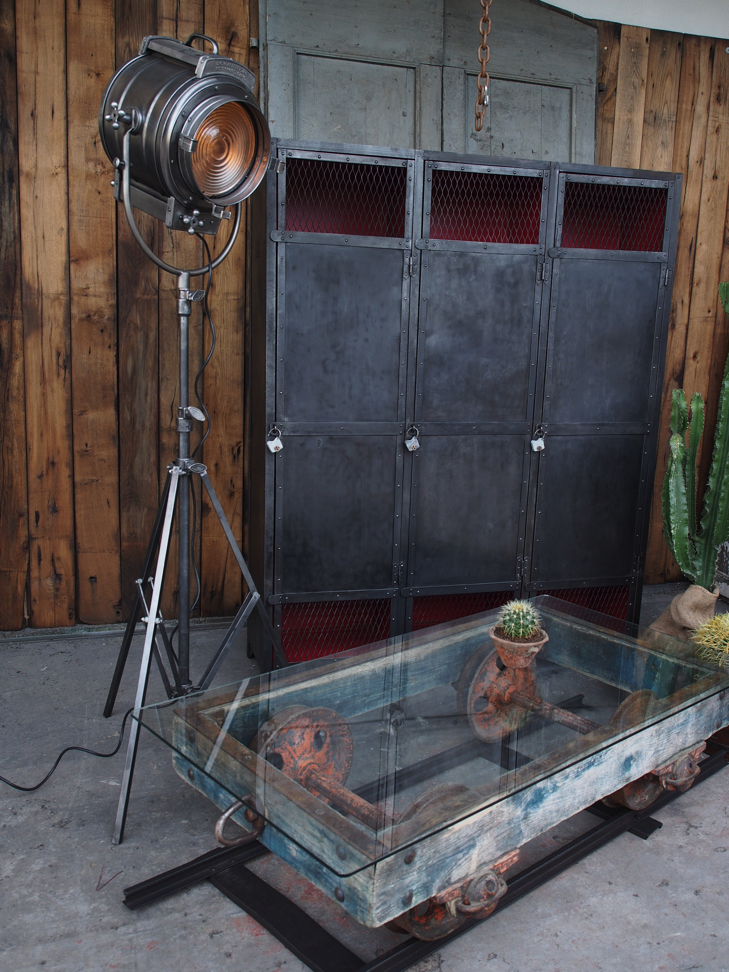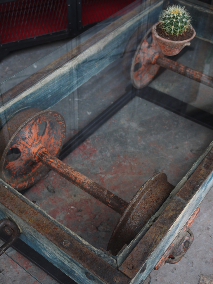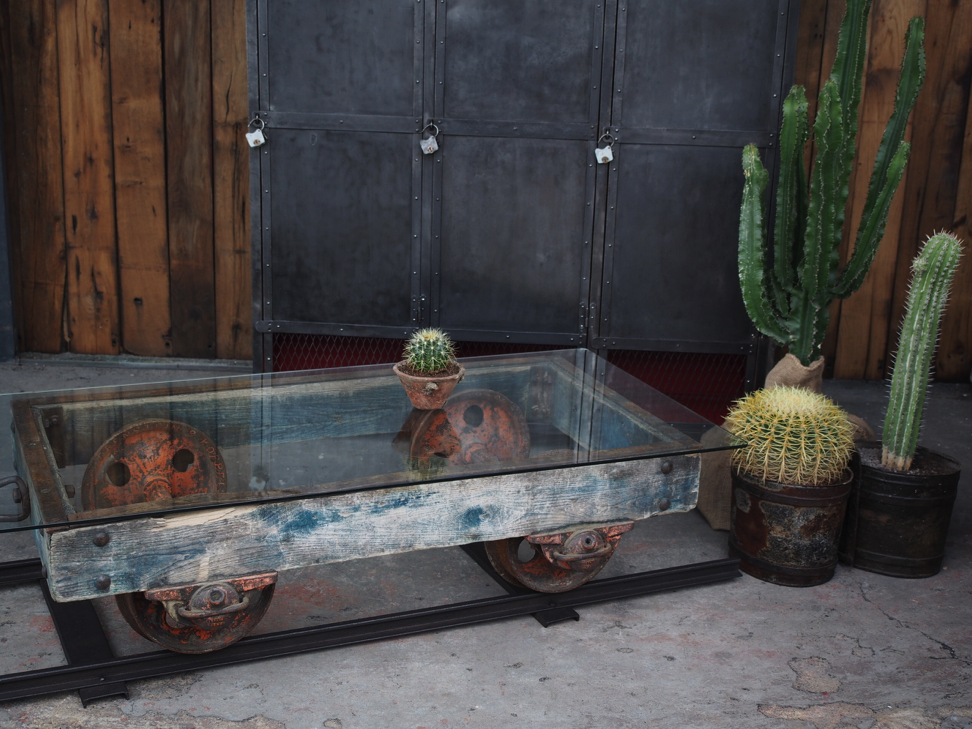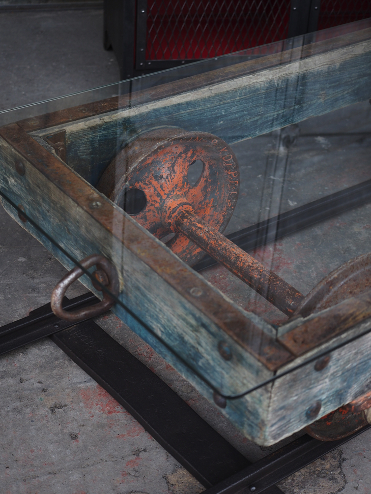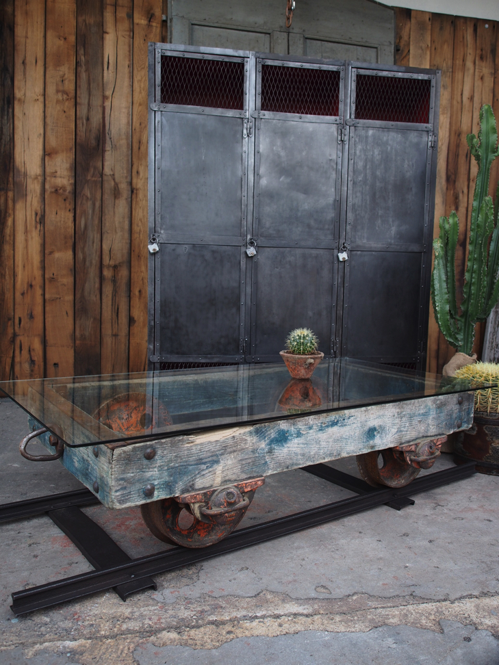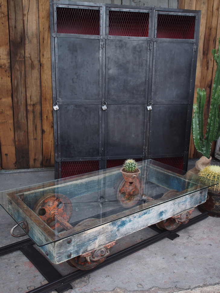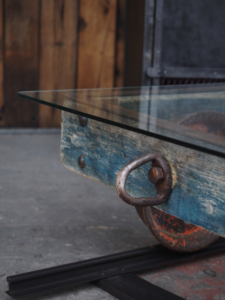 Table basse metal et bois industrielle wagon de mine sur rail plateau de verre