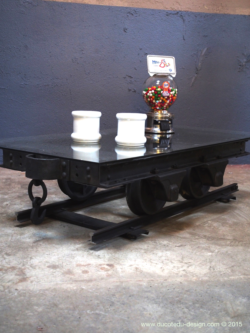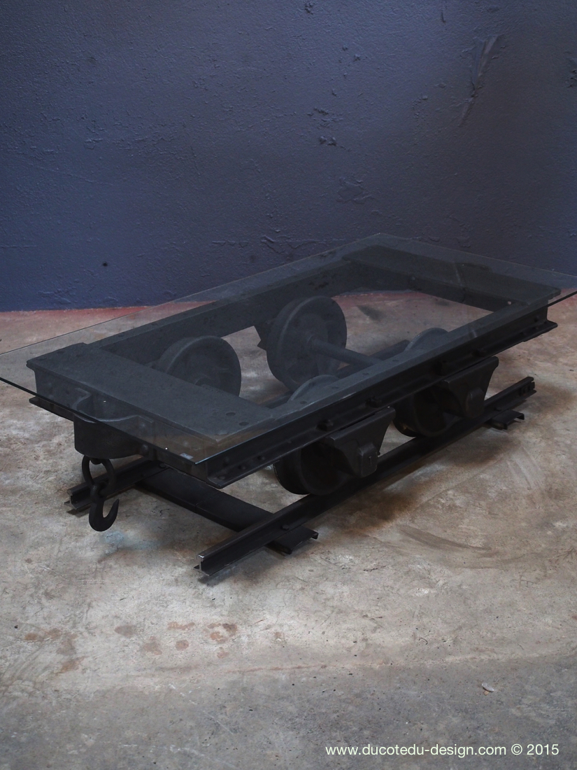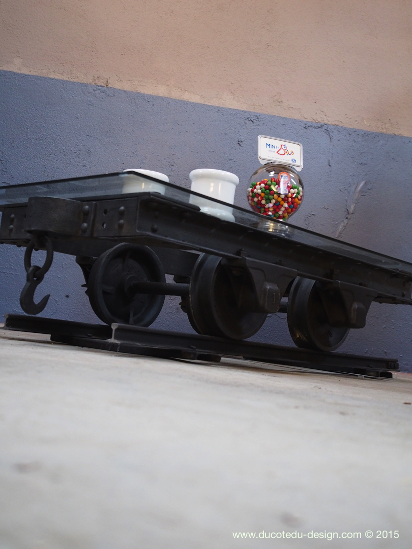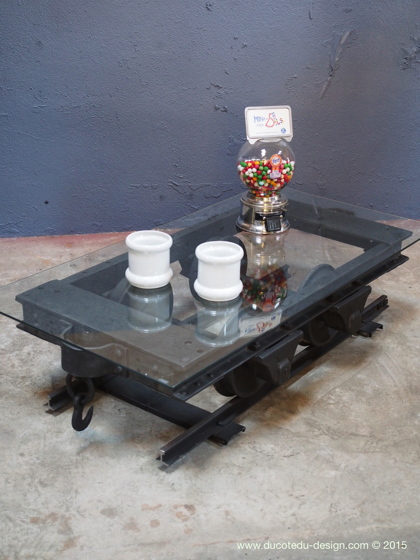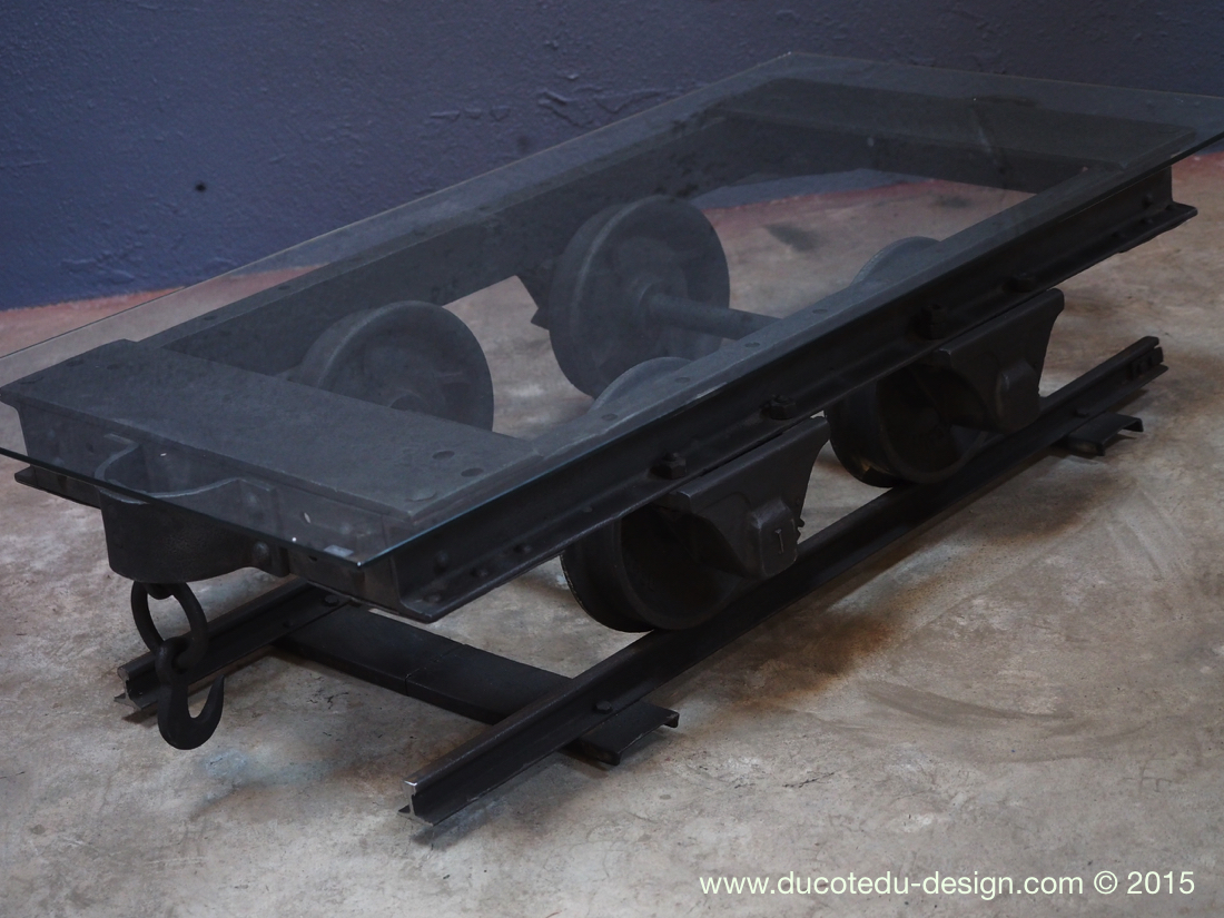 Table basse metal industrielle wagon de mine sur rail plateau de verre