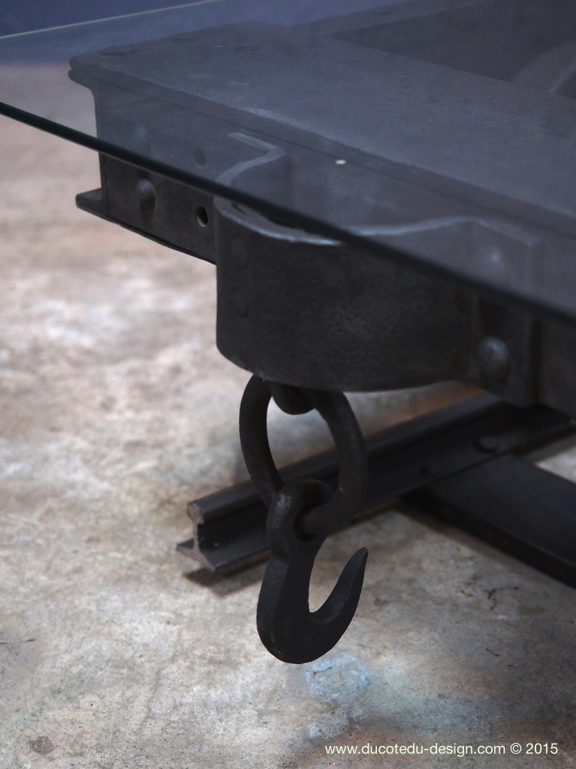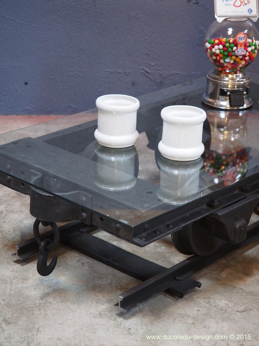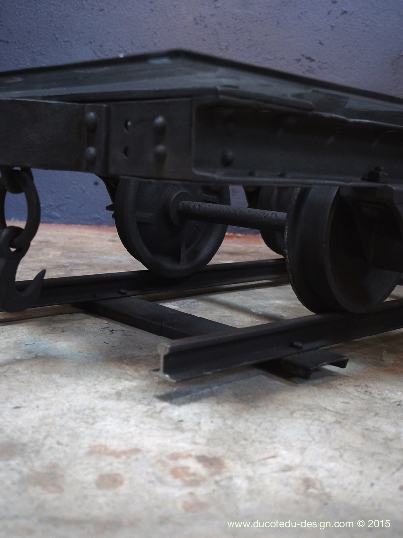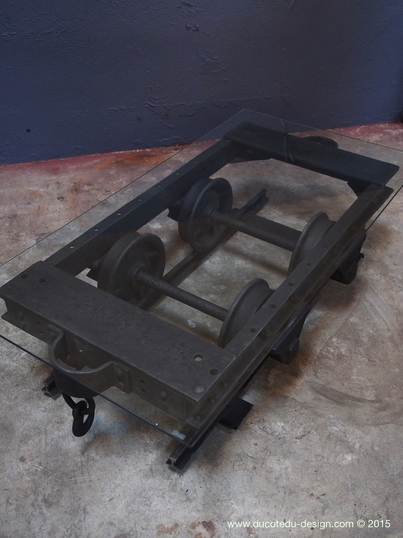 Table basse metal industrielle wagon de mine sur rail plateau de verre