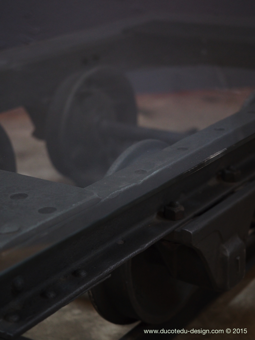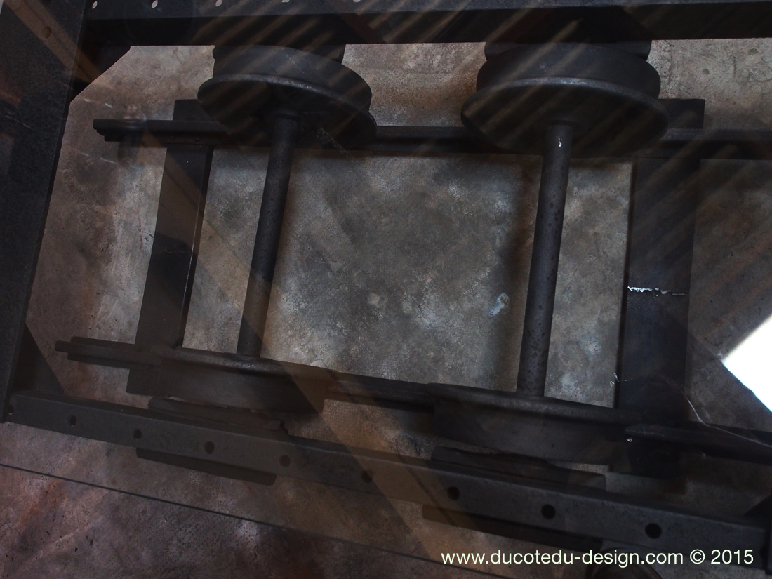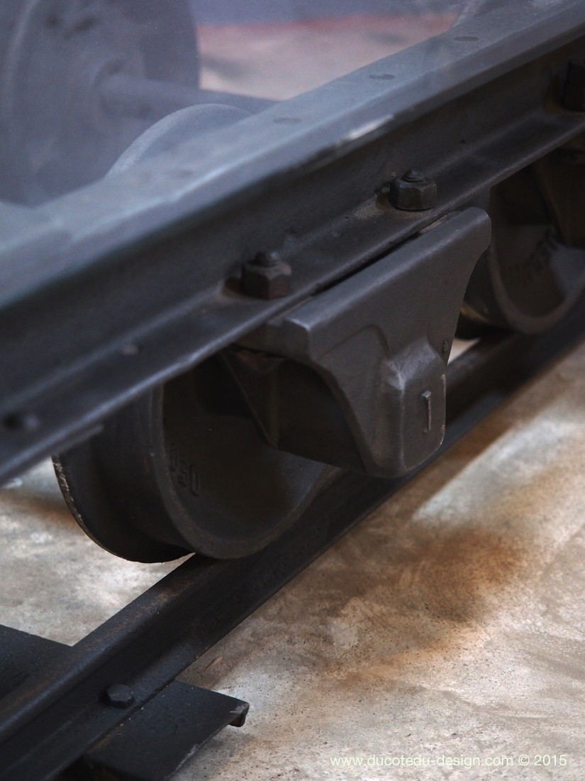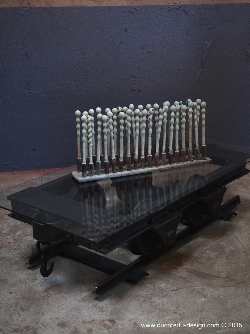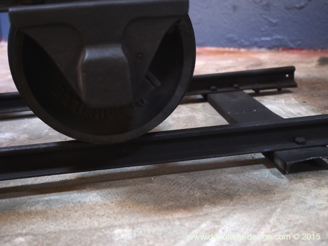 Table basse metal industrielle wagon de mine sur rail plateau de verre